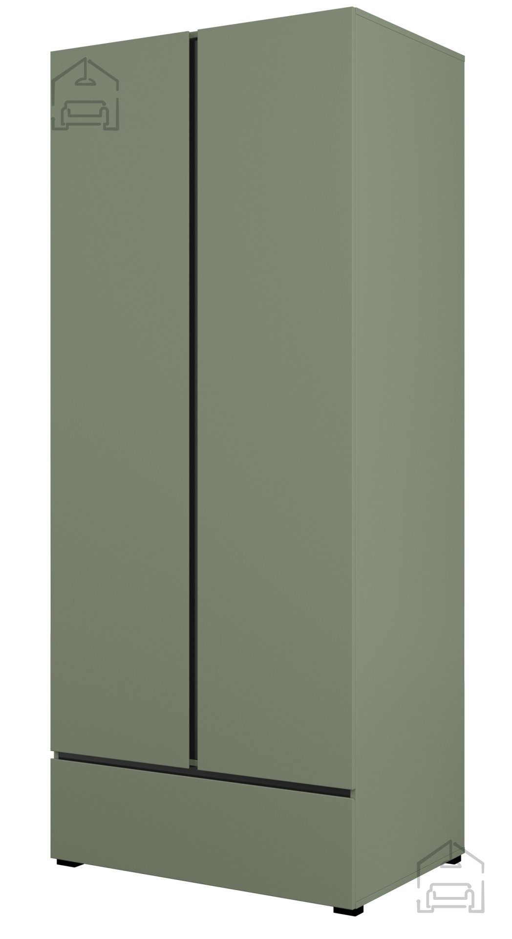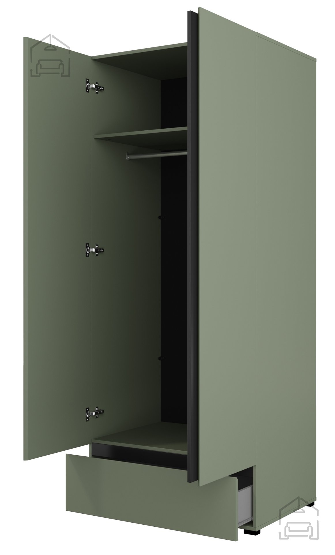 Der Kleiderschrank Cross S in Grün-Schwarz vereint Funktionalität, Ästhetik und hochwertige Verarbeitung in ausgewogener Form. Mit seinen Maßen von 89 × 60 × 210 cm nutzt er den Raum optimal und wirkt durch seine schlanke, vertikale Linie elegant – ideal sowohl für kleinere Vorzimmer als auch für großzügige Schlafzimmer. Gefertigt ist er aus einer 15 mm starken Möbelplatte, die Stabilität und Robustheit garantiert. Die Rückwand besteht aus 3 mm HDF-Platte und sorgt für zusätzliche Festigkeit und eine saubere Rückseite. Alle Kanten sind mit stoßfestem ABS geschützt, was die Lebensdauer verlängert und das gepflegte Erscheinungsbild der Oberfläche bewahrt.