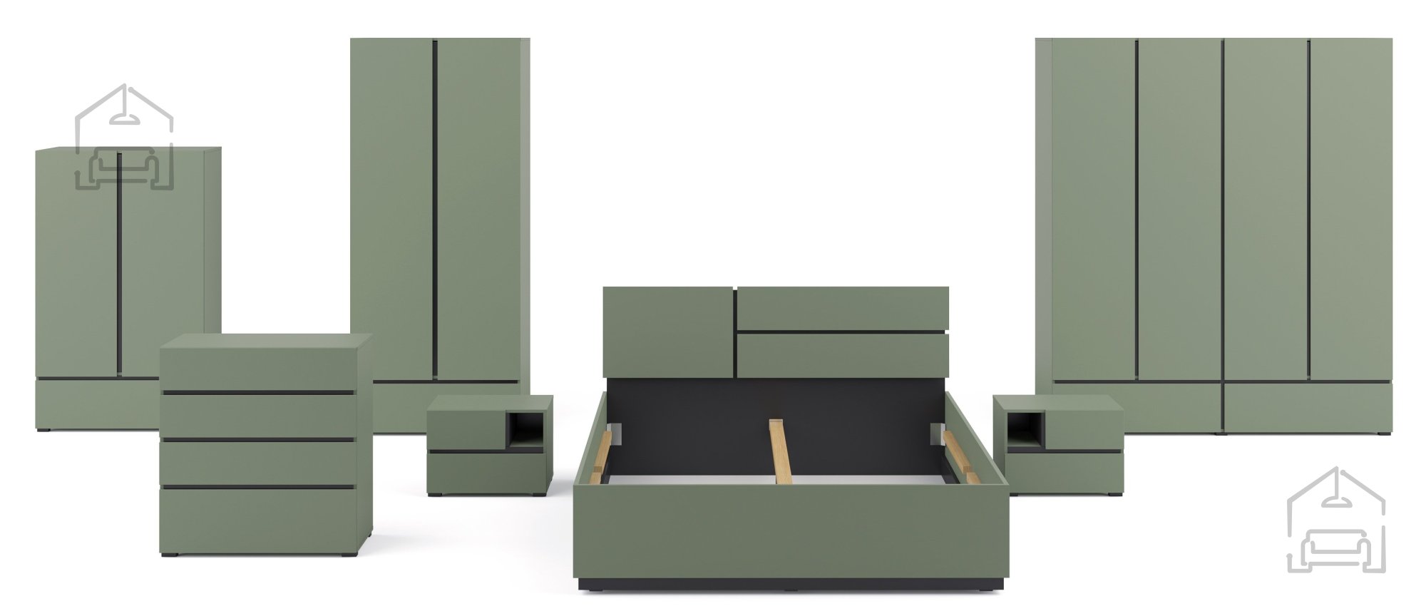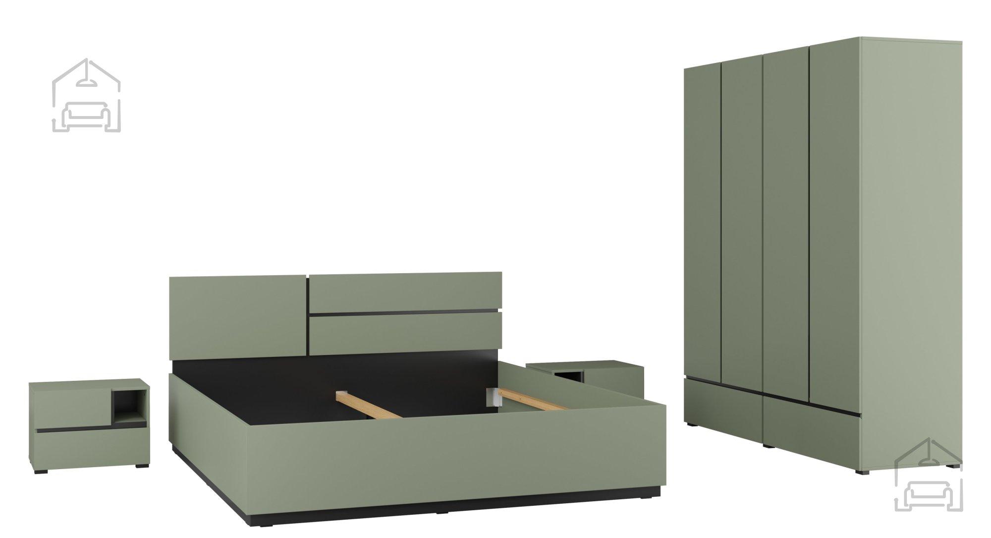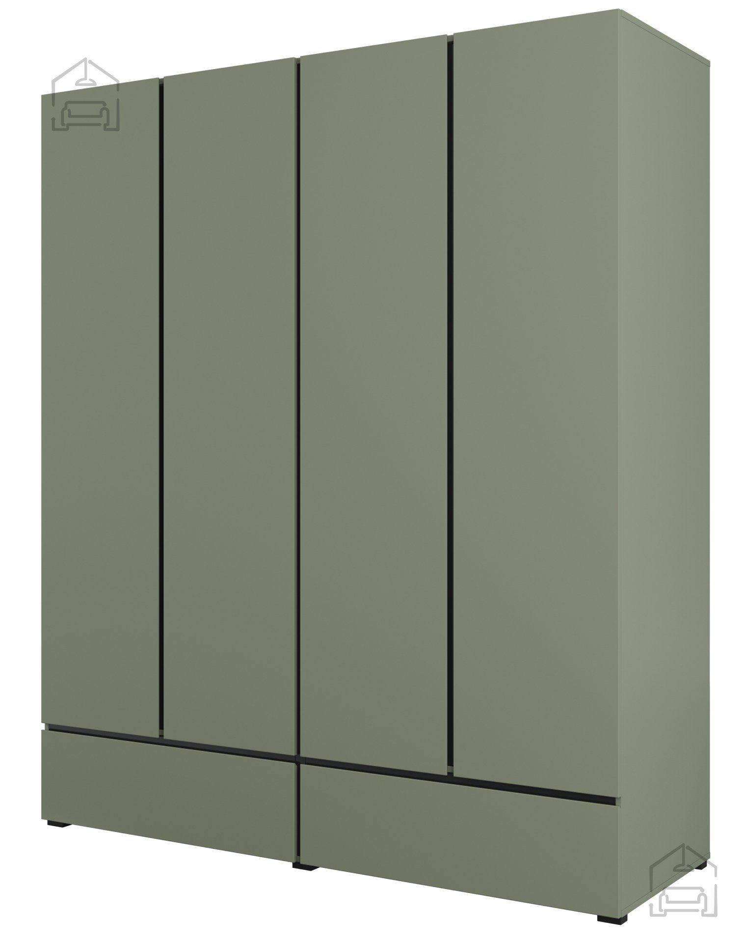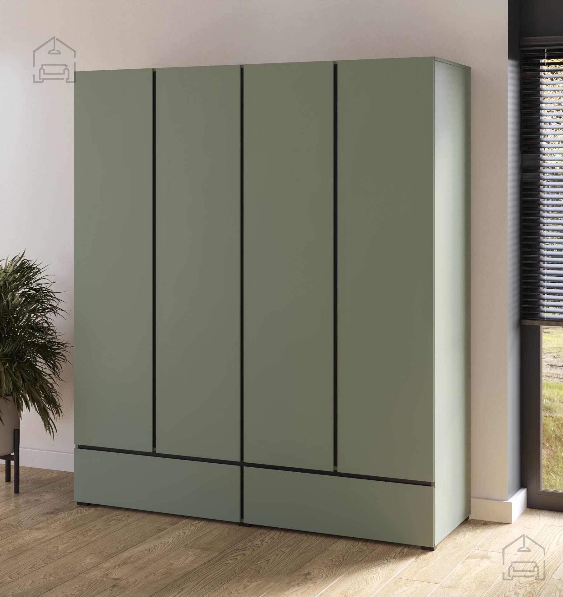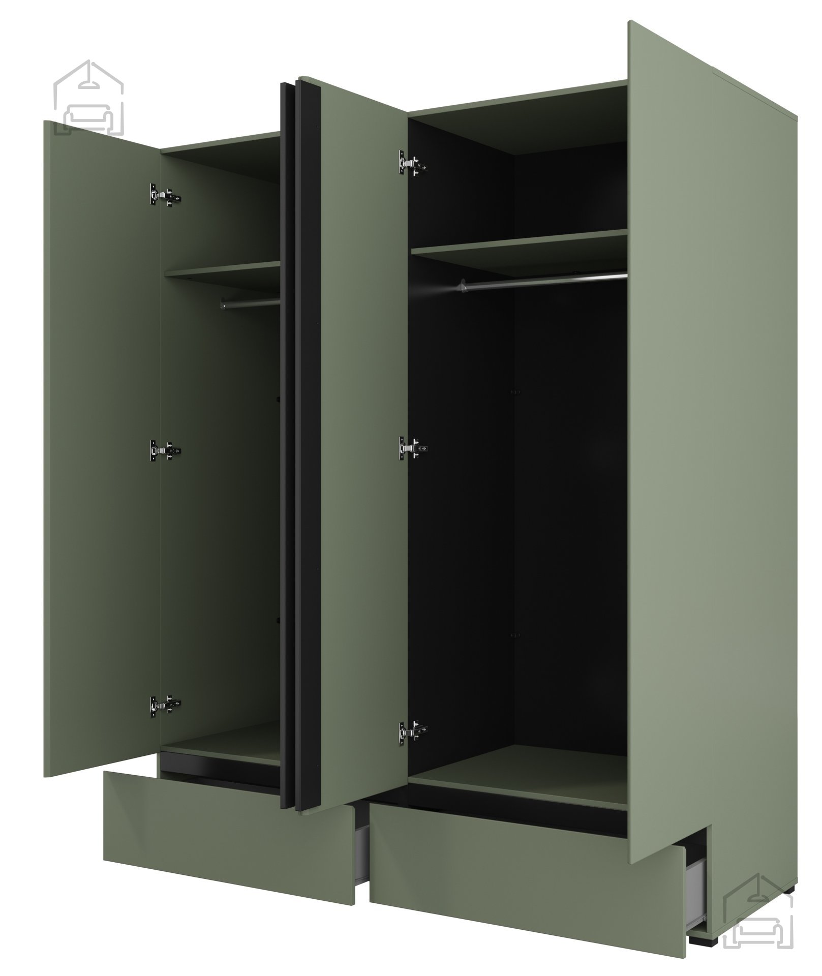 Der Kleiderschrank Cross S 2 besticht durch sein modernes Grün, das durch elegante schwarze Akzente ergänzt wird. Er bietet reichlich Platz für Kleidung, Accessoires und persönliche Gegenstände und sorgt dabei für ein ordentliches und harmonisches Gesamtbild. Gefertigt wird er in Polen in der Fabrik Helvetia meble, die für präzise Verarbeitung und hochwertige Materialien bekannt ist.