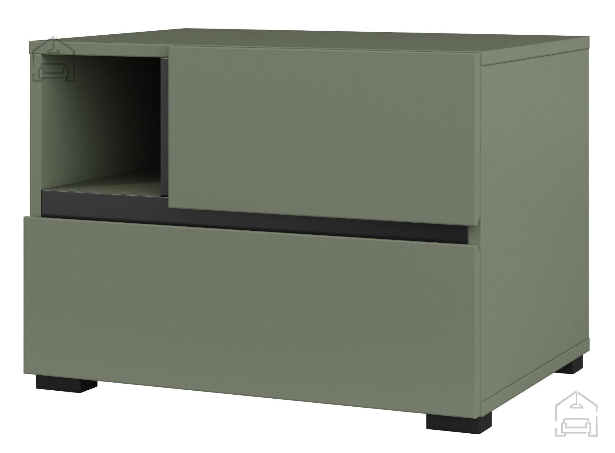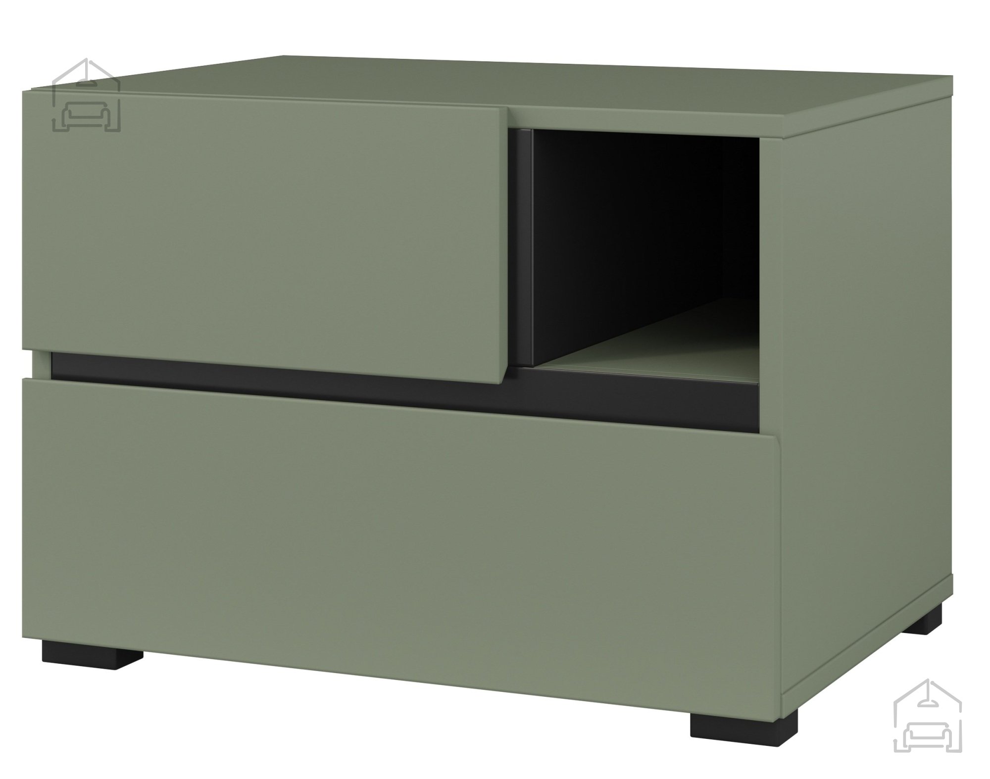 Der Nachttisch Cross S – Helvetia meble vereint ansprechendes Design, hochwertige Materialien und durchdachte Funktionalität. Das grüne Finish mit eleganten schwarzen Akzenten sorgt für einen modernen Look, während die solide Konstruktion Zuverlässigkeit im Alltag garantiert. Mit seiner praktischen Gestaltung und schlichten Eleganz ist er die ideale Wahl für alle, die im Schlafzimmer Wert auf ein ausgewogenes Zusammenspiel von Design und Nutzen legen.