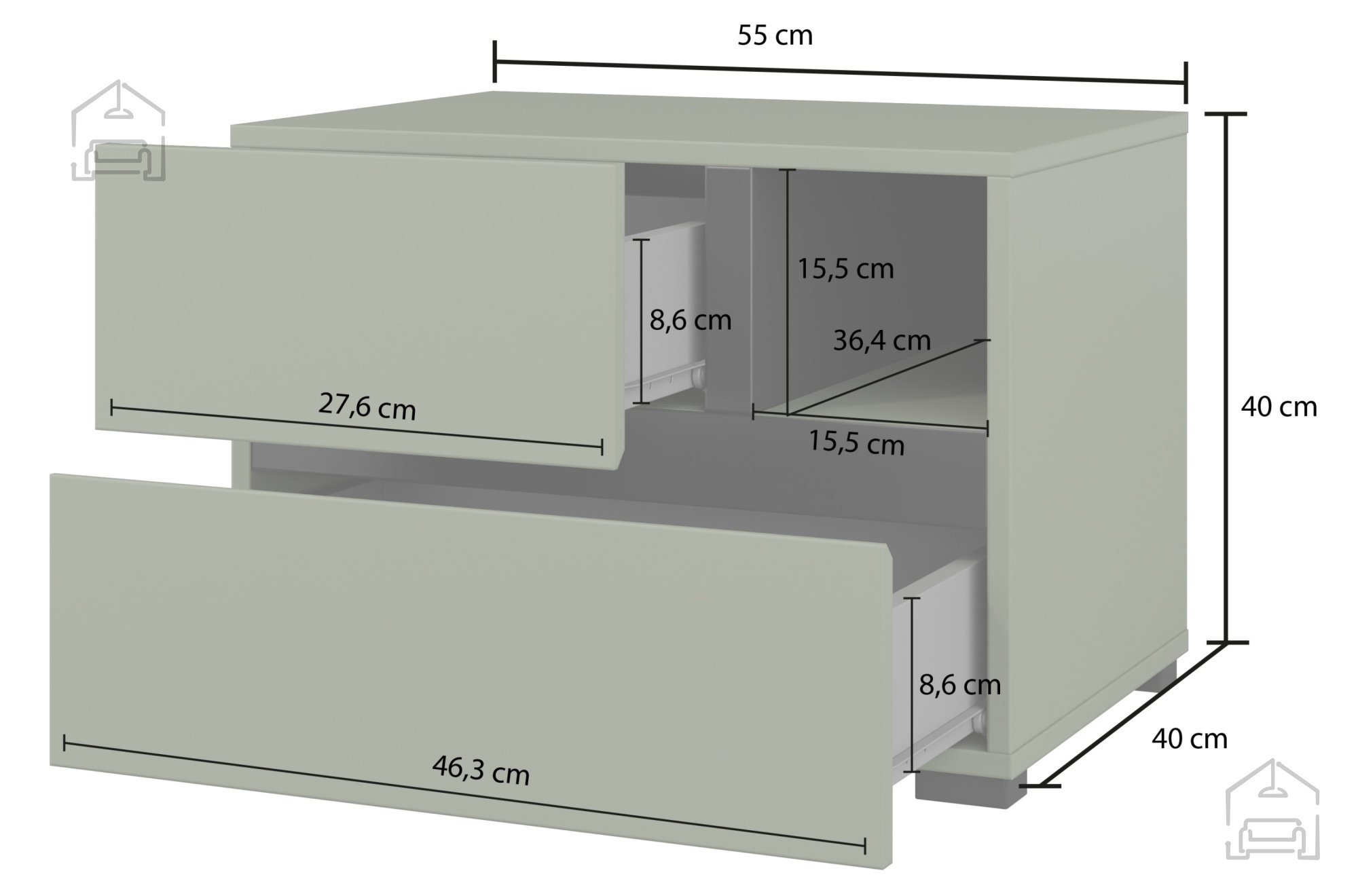 Mit seinen kompakten Abmessungen von 55 × 40 × 40 cm eignet sich der Nachttisch für verschieden große Schlafzimmer, auch wenn der Platz begrenzt ist. Die Höhe sorgt für bequemen Zugriff vom Bett aus, während die Breite Stabilität und Funktionalität bietet. Dank der ausgewogenen Proportionen kann das Möbelstück auch in anderen Räumen, etwa im Vorzimmer oder Wohnzimmer, als zusätzliche Ablagefläche dienen.