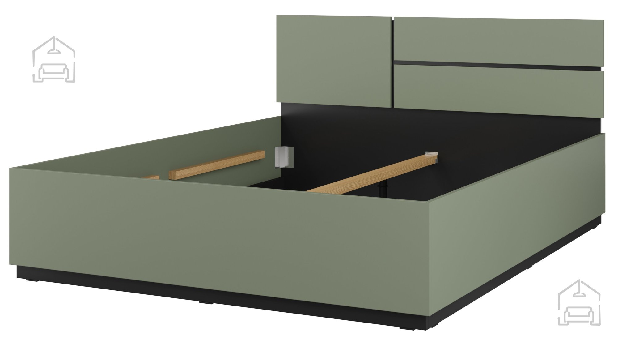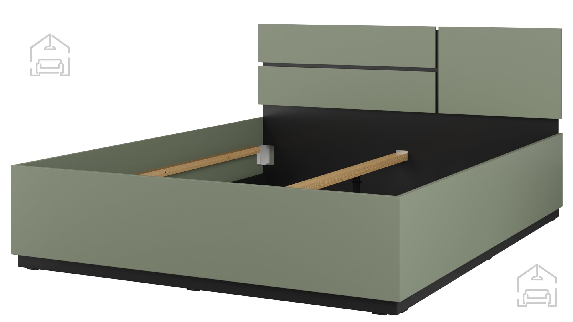 Die Kombination aus Grün und Schwarz verleiht dem Bett einen charakteristischen, modernen und zugleich ruhigen Ausdruck. Dieser Farbkontrast lässt sich mühelos mit unterschiedlichen Farbkonzepten im Schlafzimmer kombinieren. Die glatten Oberflächen und klaren Linien schaffen ein Gefühl von Ordnung und Leichtigkeit. Dank der Farbgestaltung passt das Cross S sowohl zu hellen oder neutralen Möbeln als auch als markanter Blickfang ins Schlafzimmer.