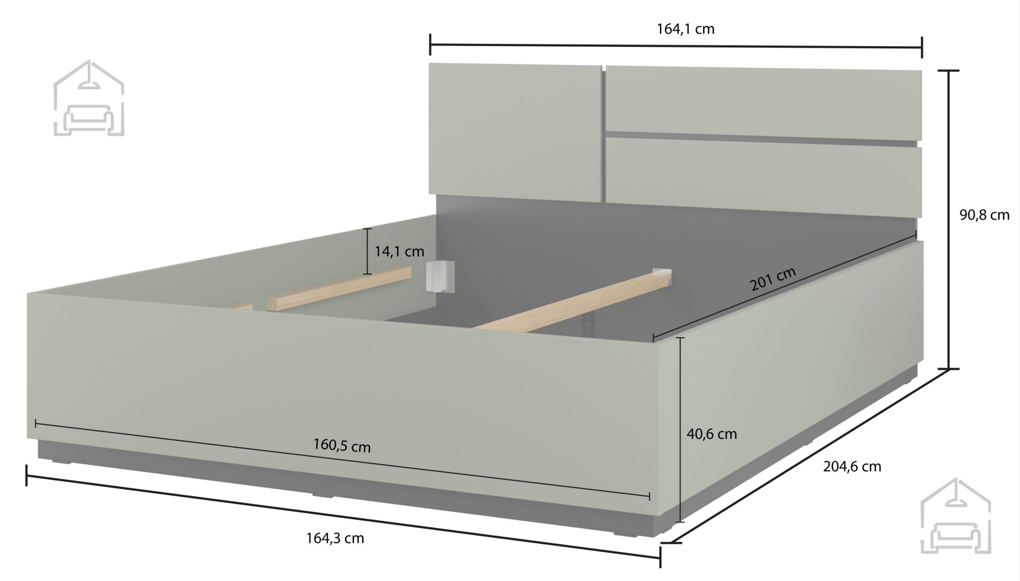 Das Bett Cross S von Helvetia Meble vereint Funktionalität, Schlichtheit und ein ansprechendes Design, wie man es vom modernen Wohnstil kennt. Mit den Maßen 164×205×91 cm ist es für eine Liegefläche von 160×200 cm ausgelegt und bietet somit ausreichend Platz und Komfort für den täglichen Gebrauch. Die grüne Farbe mit schwarzen Akzenten verleiht dem Bett einen markanten, aber harmonischen Look, der sowohl zu minimalistischen als auch zu lebendigeren Einrichtungsstilen passt.
