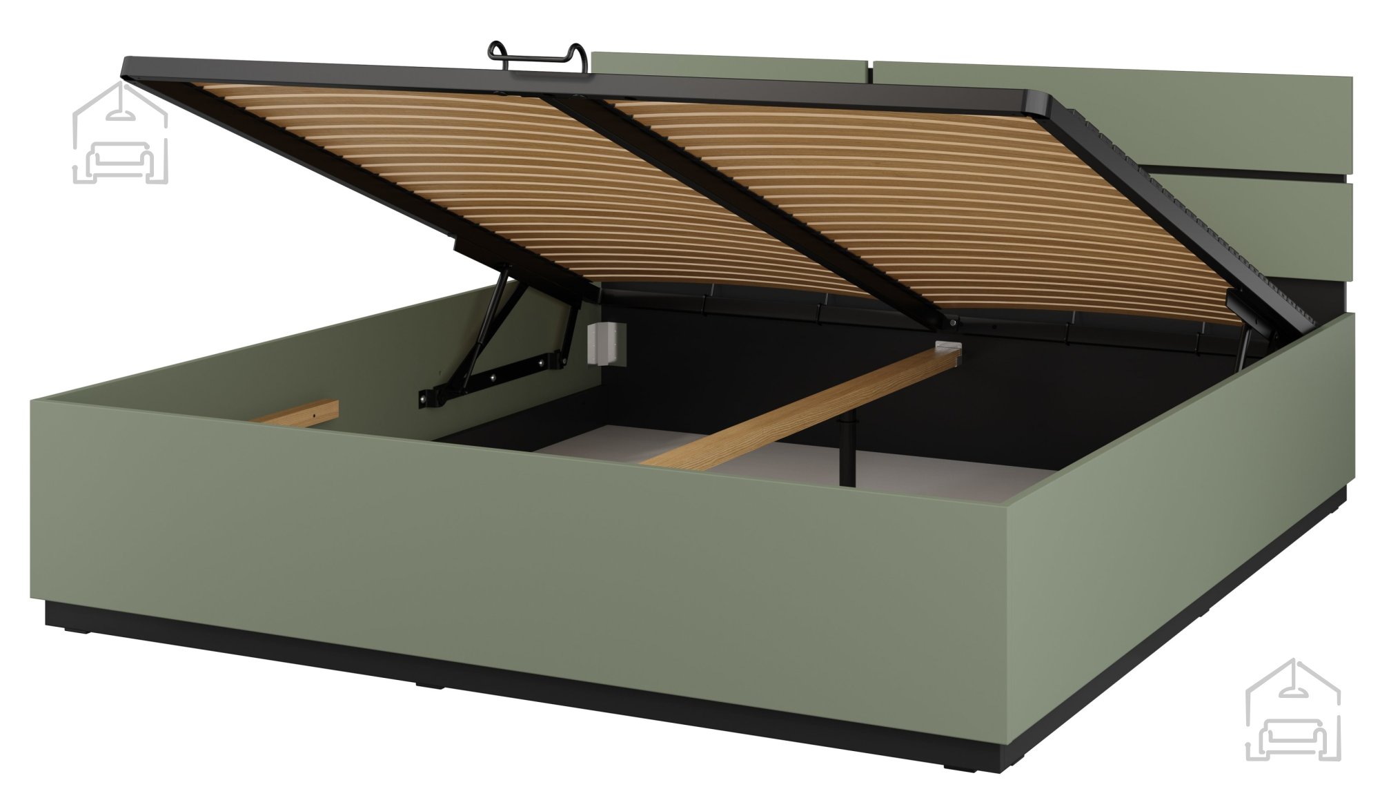 Die grüne Farbe mit schwarzen Details sorgt für ein modernes, leicht gewagtes Erscheinungsbild – perfekt für junge oder minimalistische Einrichtungen. Die Oberflächen sind glatt, pflegeleicht und kratzfest, sodass das Bett lange seinen ursprünglichen Look behält. Dank der klaren Linien lässt es sich wunderbar mit unterschiedlichen Wandfarben und Textilien kombinieren, was die Gestaltung des Schlafzimmers erleichtert.