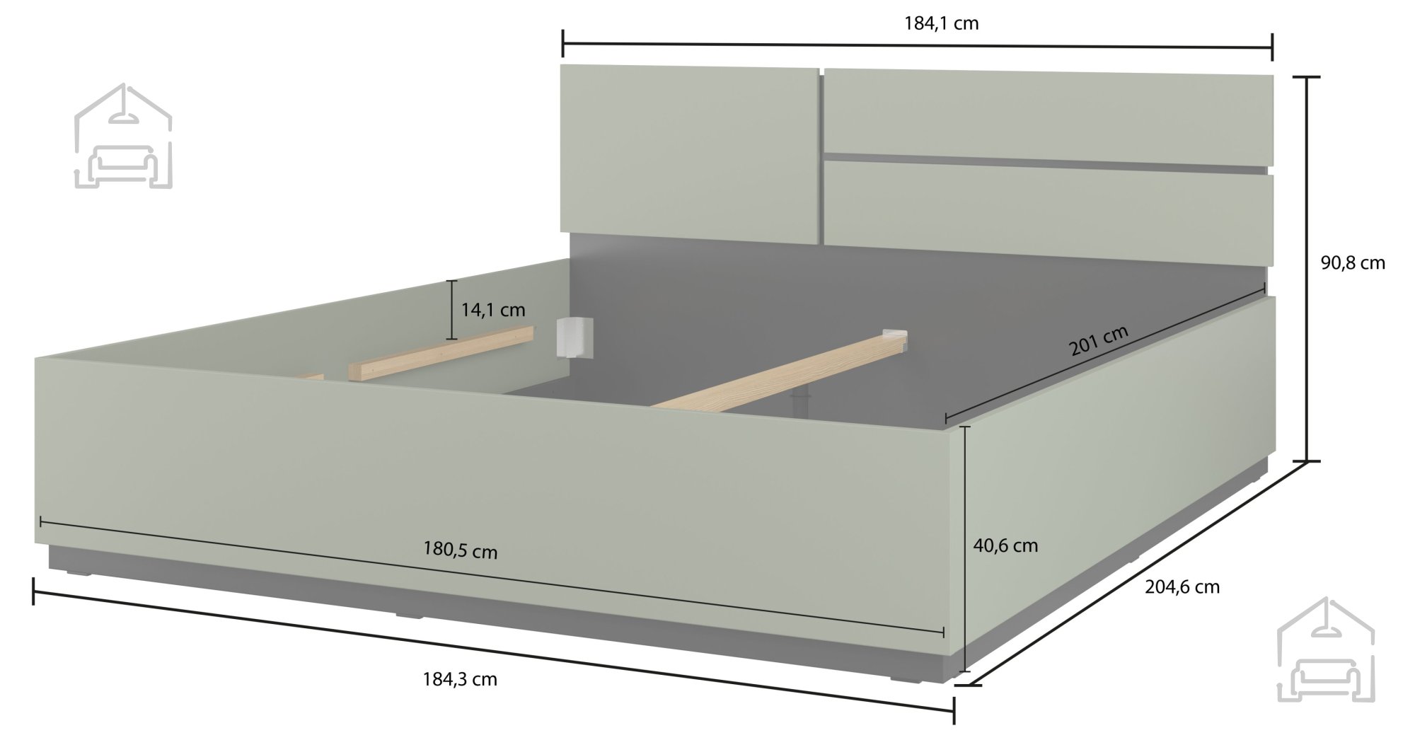 Das Bett ist mit einem Lattenrost ausgestattet, der für gleichmäßige Unterstützung der Matratze sorgt und eine gute Belüftung gewährleistet. Die Liegefläche von 180 × 200 cm bietet ausreichend Platz für zwei Personen und schafft ideale Voraussetzungen für erholsamen Schlaf. Obwohl die Matratze nicht im Lieferumfang enthalten ist, können Sie frei jene wählen, die Ihren persönlichen Vorlieben in Bezug auf Härtegrad und Material entspricht.