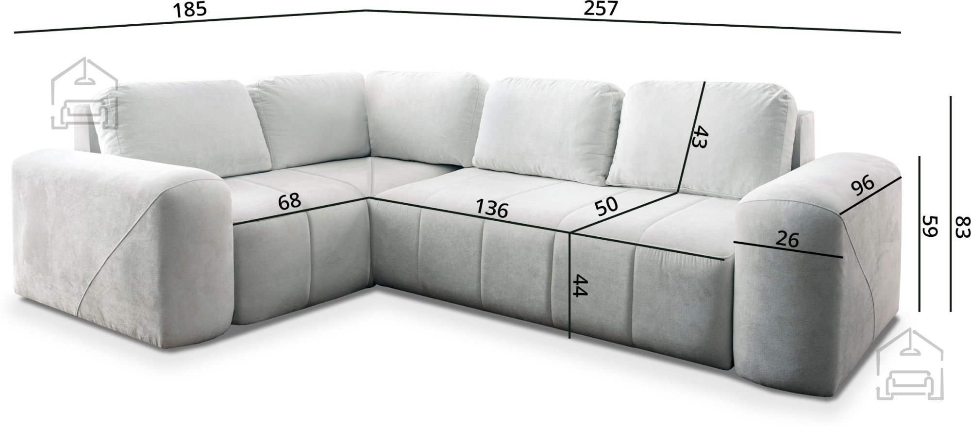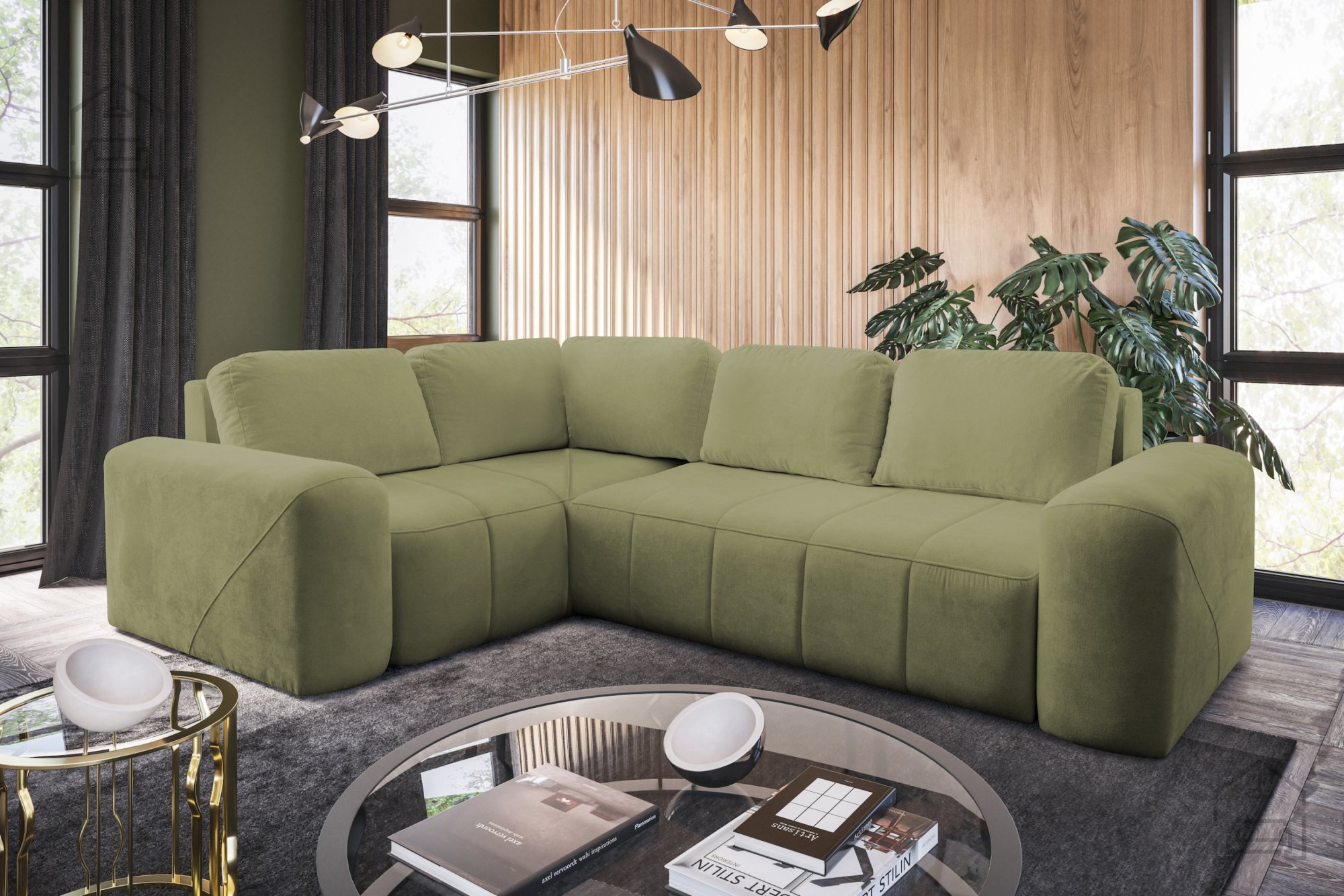 Auf dem Foto ist die Garnitur im Stoff Spring 1105 gezeigt, der durch seine angenehme Haptik und leichte Pflege überzeugt. Die Farbpalette ist umfangreich, sodass Sie das Sofa perfekt auf Ihre Wohnraumfarben abstimmen können. Das Modell ist in mehreren Farben erhältlich und fügt sich harmonisch in verschiedenste Einrichtungsstile ein – von modern bis klassisch.