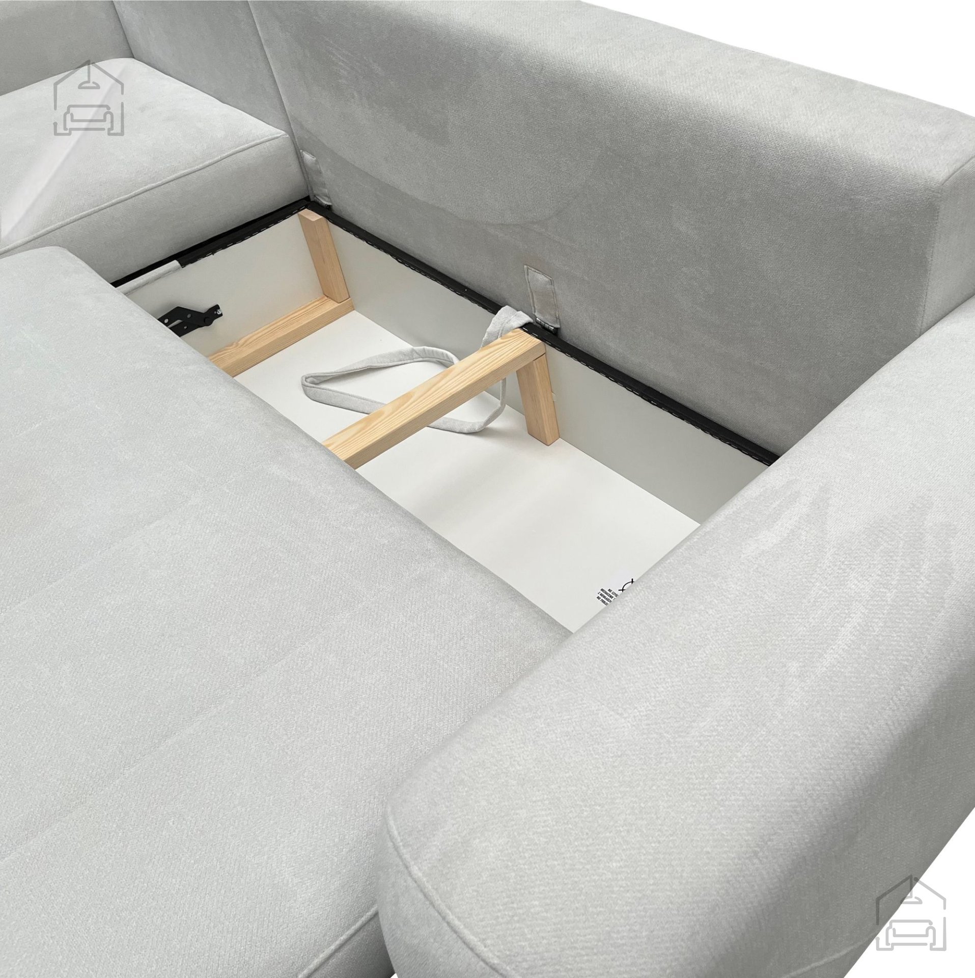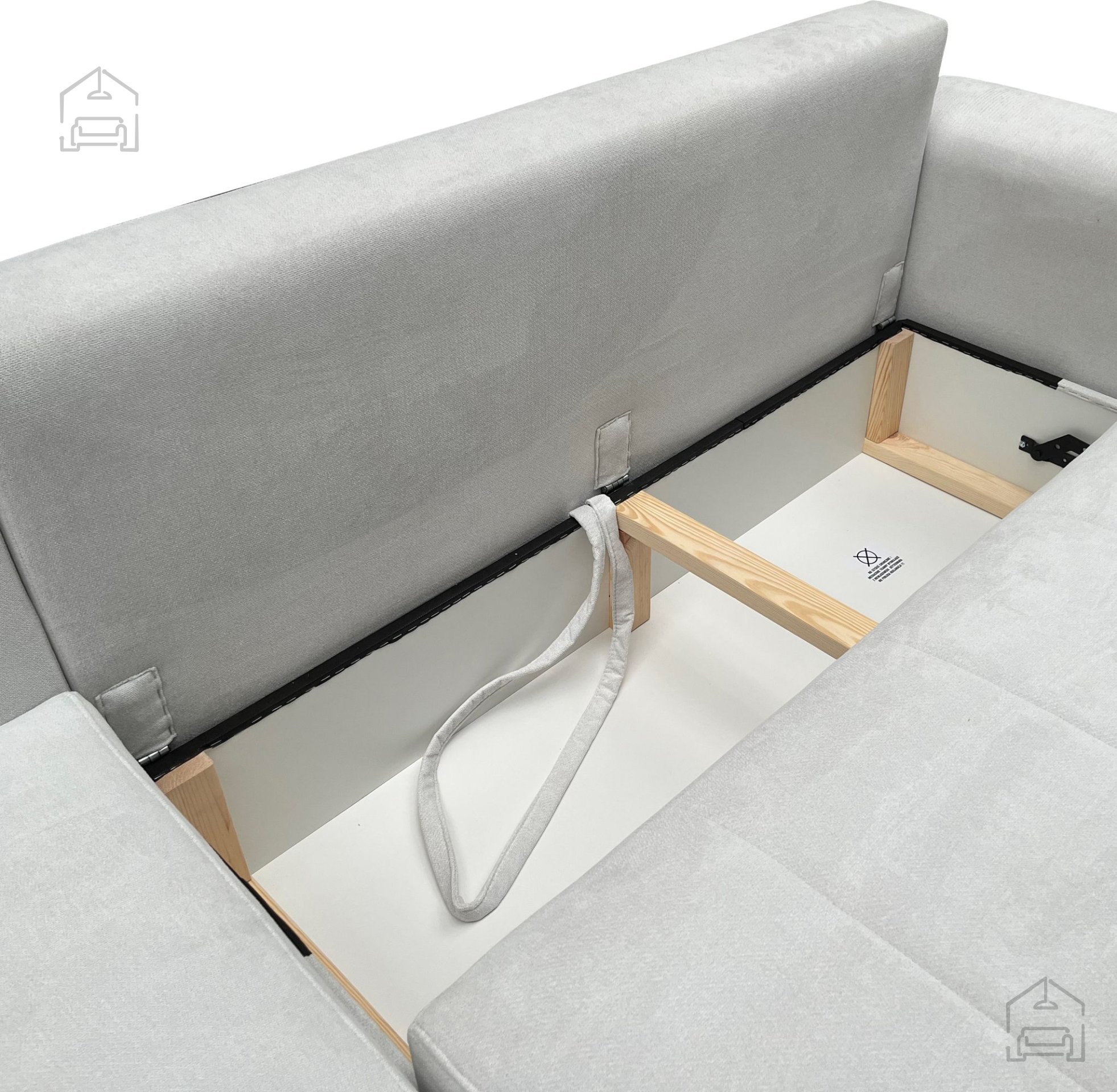 Das Modell Novelo III ist mit einem zuverlässigen Euro-Mechanismus ausgestattet, der das Ausziehen zu einer Schlafgelegenheit einfach und schnell macht. Im ausgeklappten Zustand entsteht eine bequeme Liegefläche von 205x125 cm, ausreichend für zwei Personen. Die Garnitur verfügt über einen Bettkasten, in dem Decken, Kissen oder Bettwäsche ordentlich verstaut werden können – eine praktische Lösung für ein aufgeräumtes Zuhause. So gewinnen Sie zusätzliche Funktion, ohne auf ein ansprechendes Design zu verzichten.