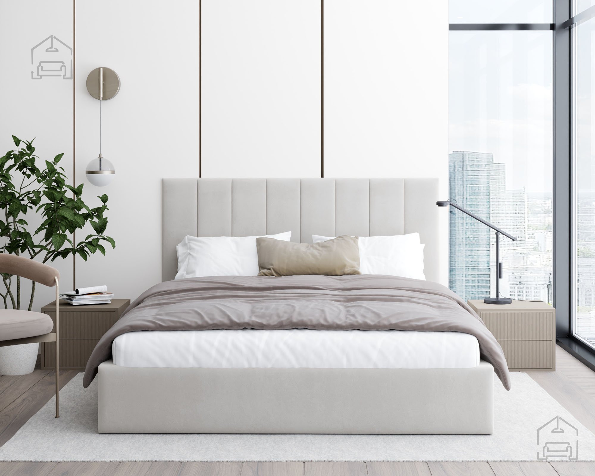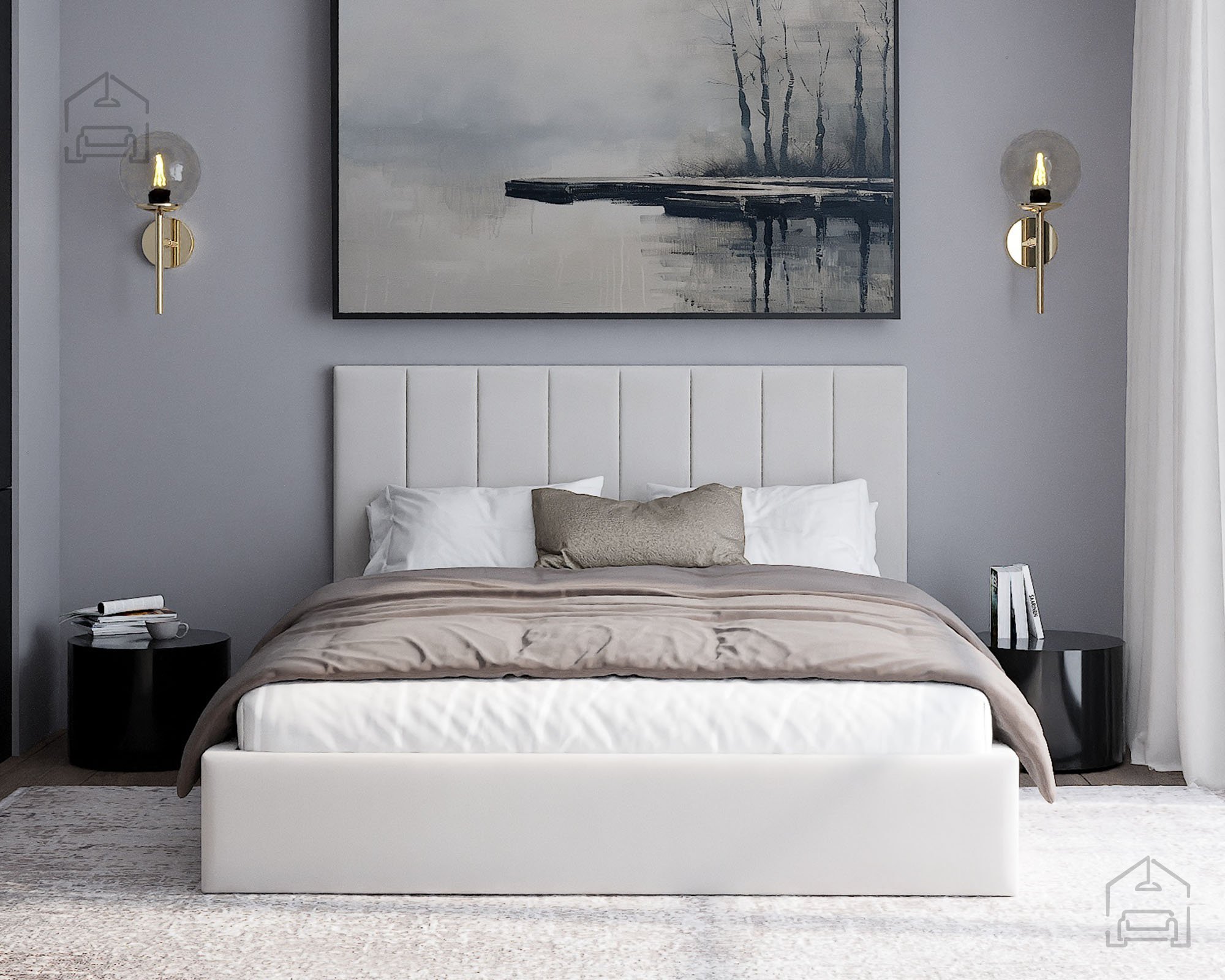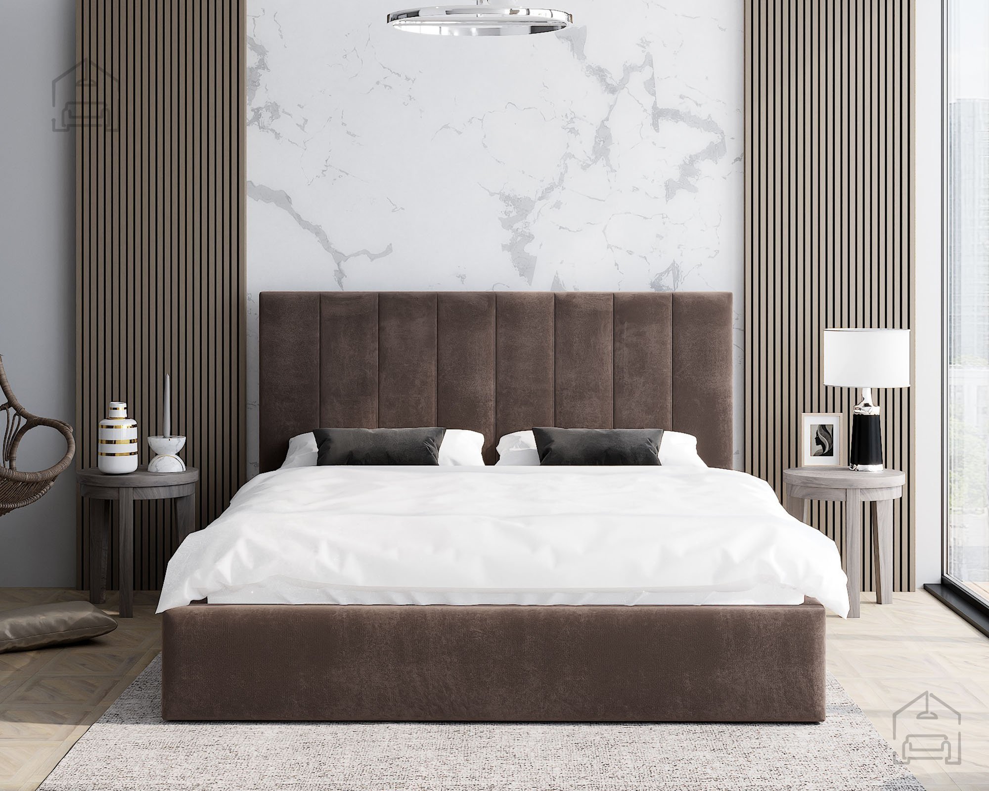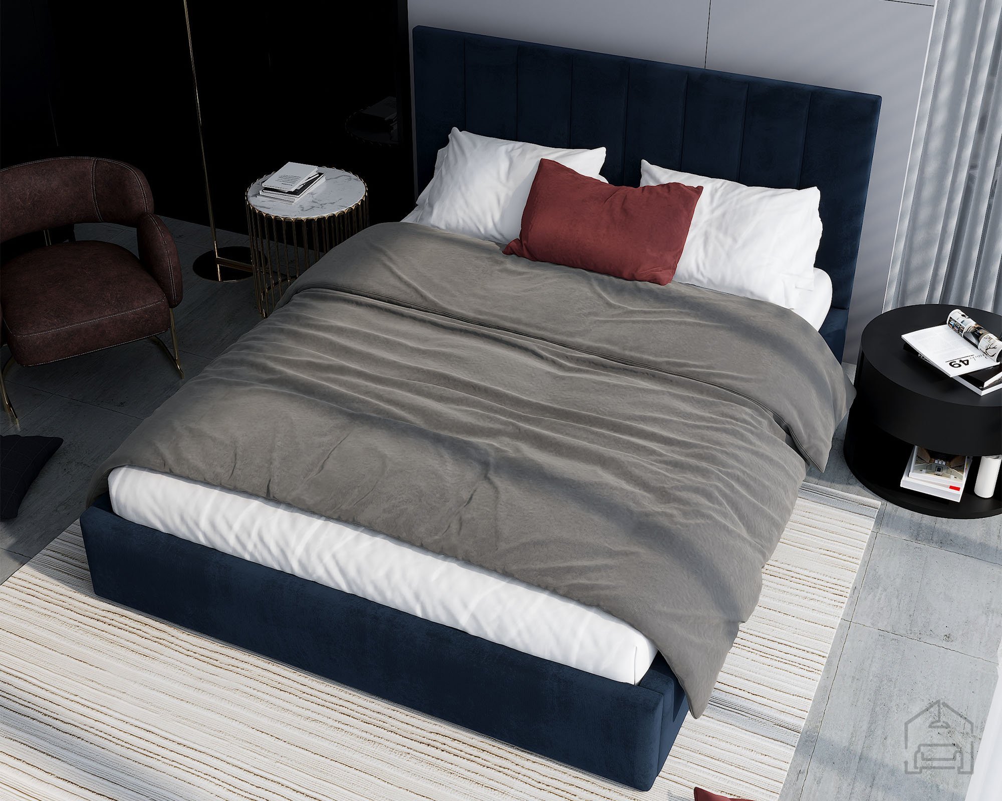 Der Rahmen des Bettes Justin ist vollständig gepolstert und verleiht dem Raum eine warme, gemütliche Atmosphäre. Auf dem Foto ist der Stoff Paris Deep Blue zu sehen – ein tiefes Blau, das moderne Eleganz ausstrahlt und sich leicht mit unterschiedlichen Einrichtungsstilen kombinieren lässt. Das Bett ist in mehreren Farben erhältlich, sodass es sich individuell an die Farbgestaltung des Schlafzimmers anpassen lässt.