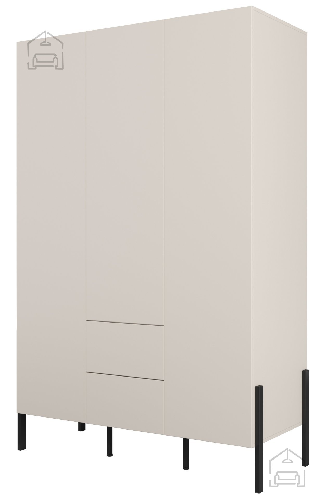 Die Kaschmirfarbe mit matter Oberfläche vermittelt Wärme und Ruhe. In Kombination mit den schwarzen Metallfüßen wirkt der Schrank elegant und modern und lässt sich mühelos mit unterschiedlichen Farb- und Einrichtungsstilen kombinieren. Aluminiumdetails runden das Design ab und erhöhen die Stabilität der Konstruktion. Die Oberfläche der Möbelplatte ist pflegeleicht und unempfindlich gegenüber täglicher Beanspruchung.
