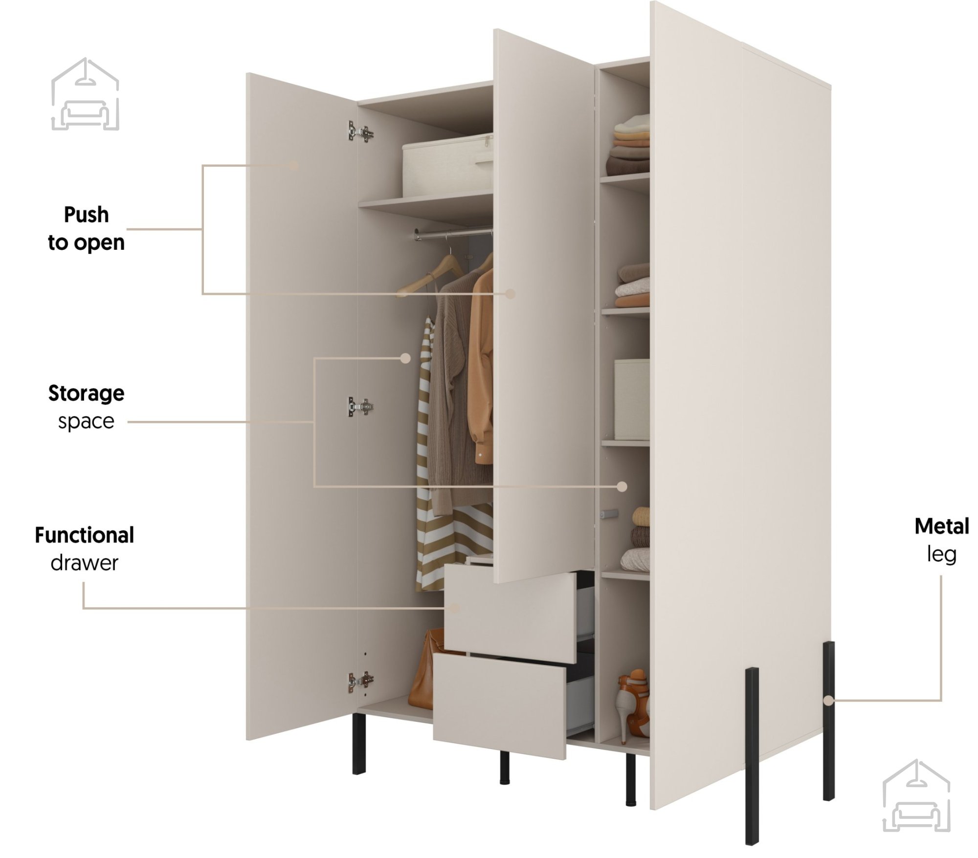Metallfüße und Push-to-open-Mechanismus: Kleiderschrank Jukon S – Helvetia.