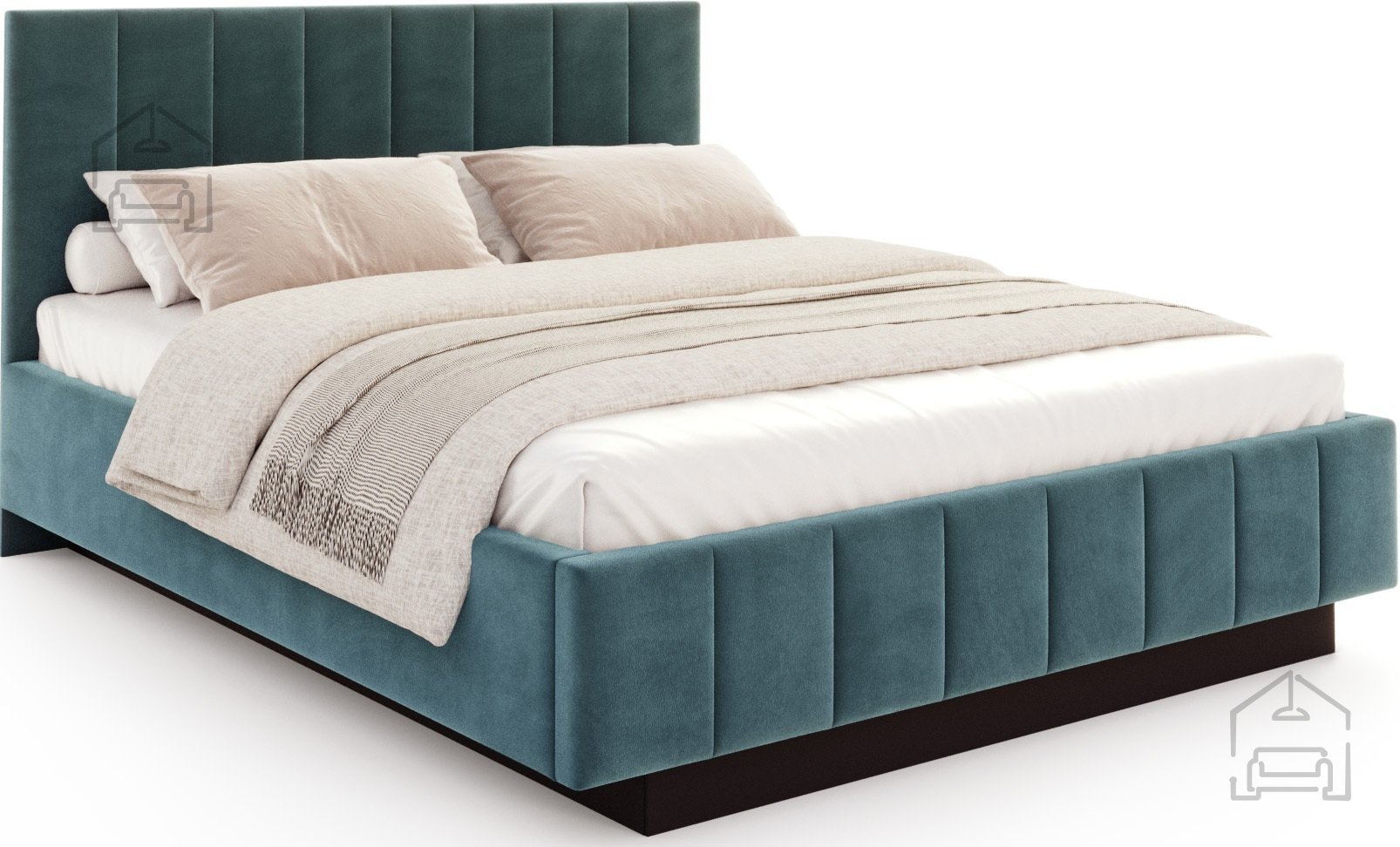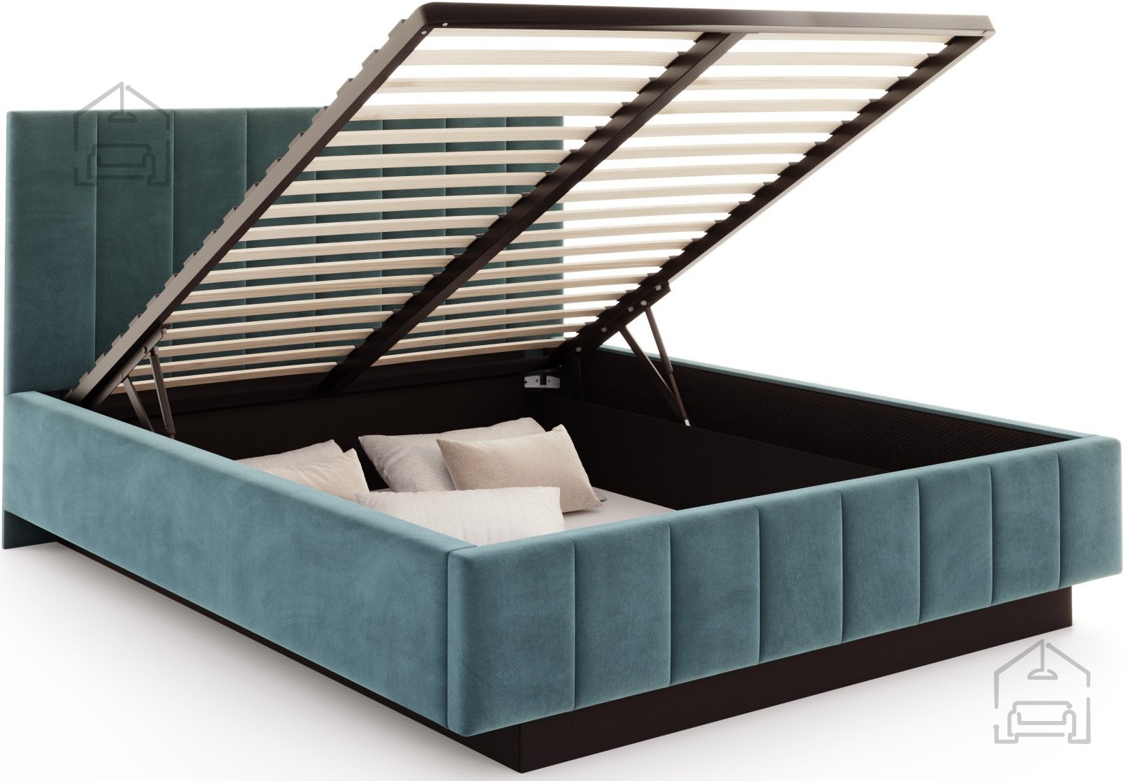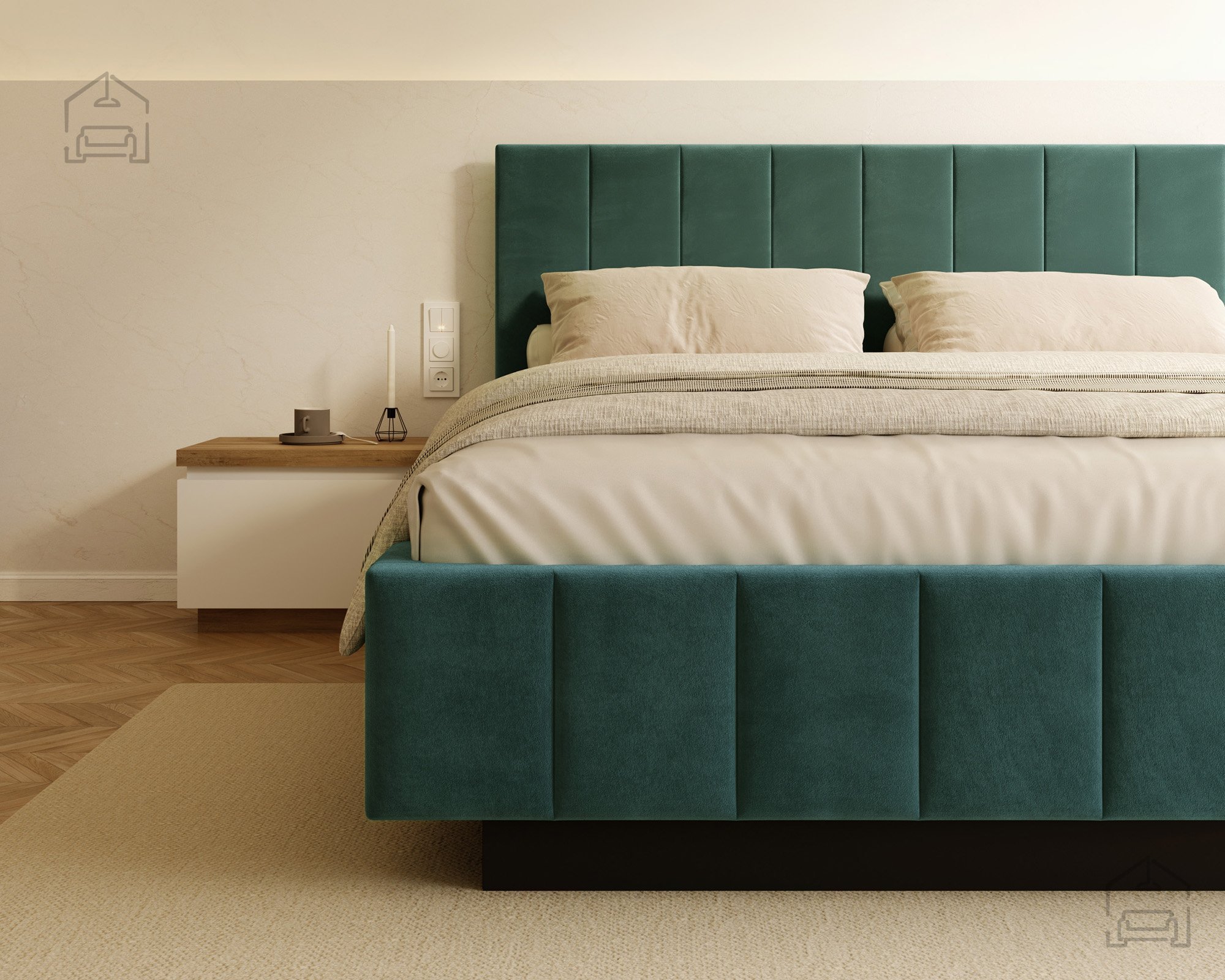 Das Modell Levito überzeugt sowohl optisch als auch praktisch. Der gepolsterte Rahmen ist in mehreren Farben erhältlich; auf dem Foto ist der Stoff Trinity Turquoise abgebildet. Dank des klaren, modernen Designs passt das Bett ideal in minimalistische und elegante Räume, in denen Wert auf klare Linien und ein offenes Raumgefühl gelegt wird.