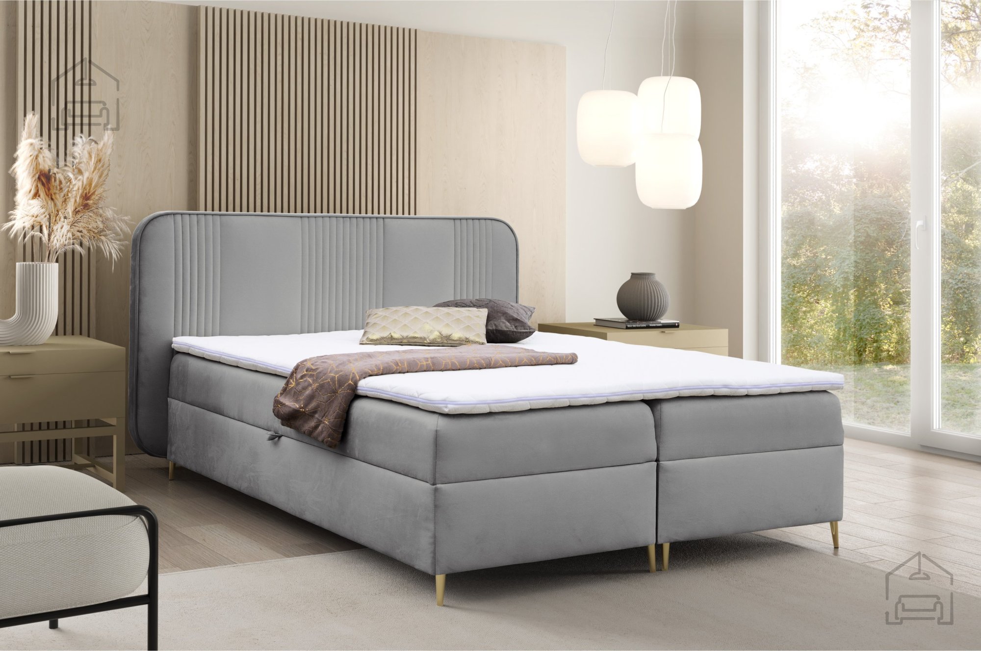 Die eleganten Linien und die samtige Struktur des Stoffes Magic Velvet 2217 schaffen eine warme, stilvolle Atmosphäre. Die Kombination aus weicher Textur und goldenen Metallfüßen wirkt modern, aber gleichzeitig zeitlos. Das Bett ist in mehreren Farben erhältlich und lässt sich sowohl in klassische als auch in minimalistische Einrichtungen harmonisch integrieren. Der gepolsterte Rahmen verleiht dem Bett eine sanfte Optik und schützt gleichzeitig vor unangenehmen Stößen an den Bettkanten.