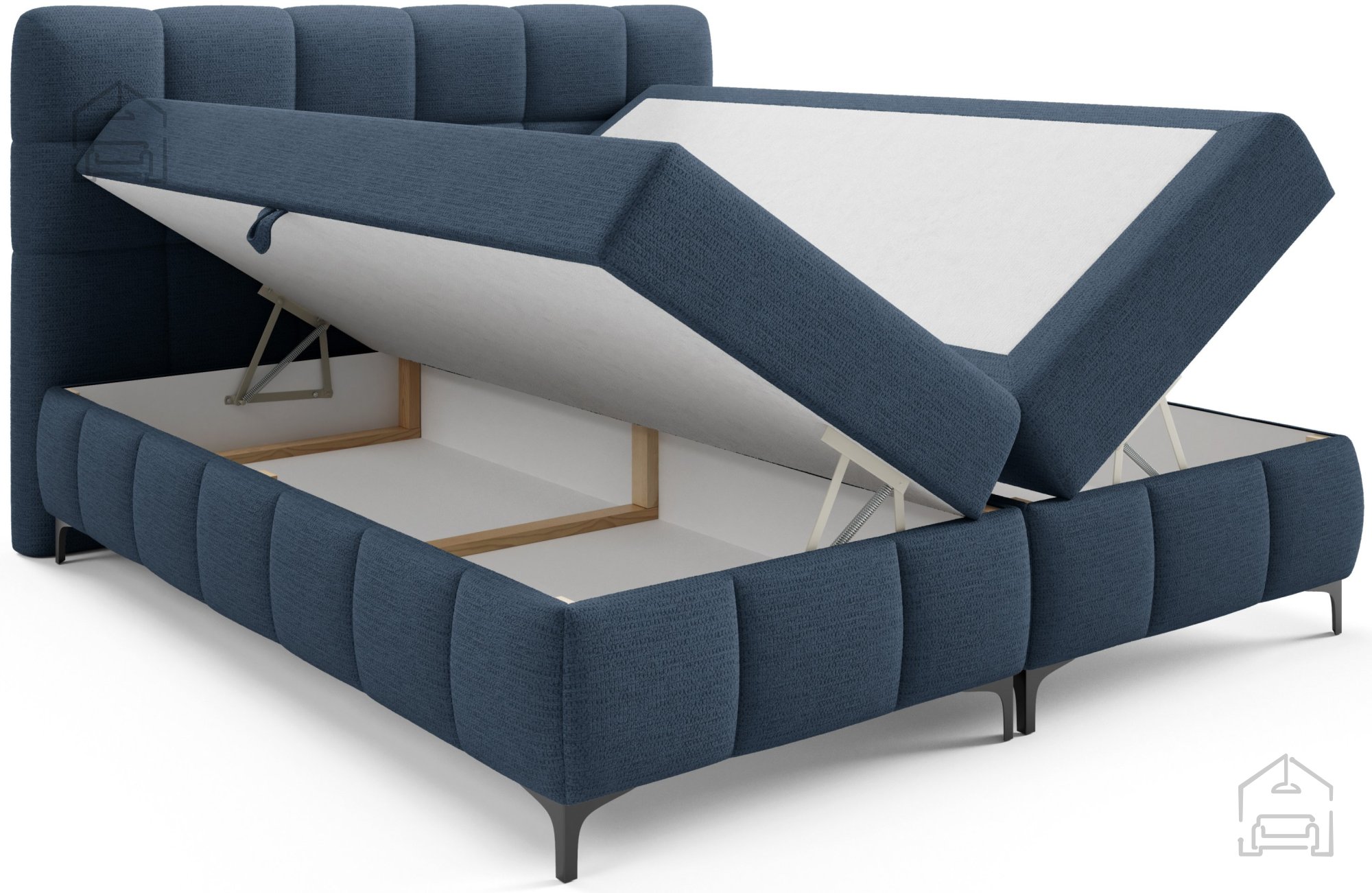 Die Boxspring-Konstruktion besteht aus mehreren Schichten: Der untere Teil bildet die gefederte Basis, darauf liegt eine Bonell-Federkernmatratze mit einem zusätzlichen Topper aus T-25-Schaumstoff mit einer Stärke von 4 cm. Diese Kombination sorgt für ein weiches Liegegefühl und gleichzeitig für eine gute Unterstützung der Wirbelsäule. Die Bonell-Federn gewährleisten eine gleichmäßige Gewichtsverteilung und gute Luftzirkulation, was Feuchtigkeitsbildung reduziert und die Lebensdauer der Matratze verlängert.