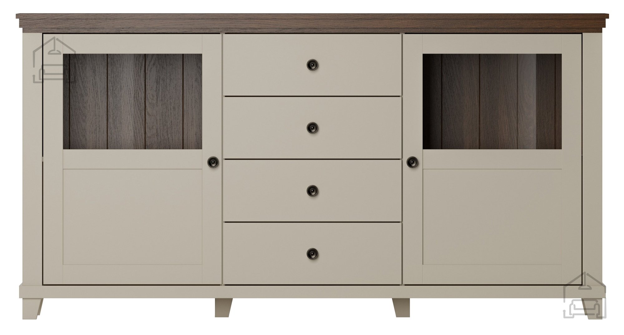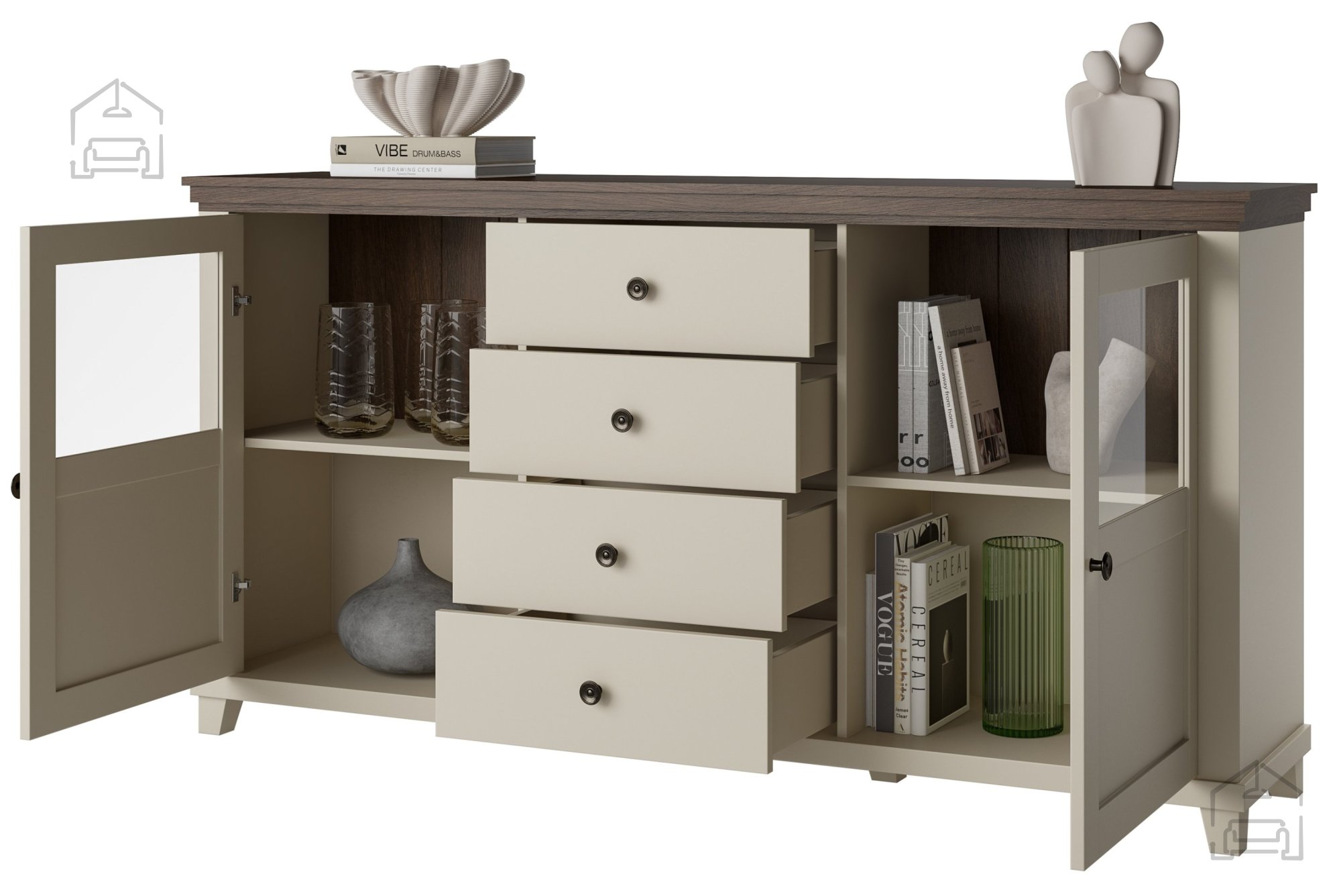 Die Kommode Evora ist auf praktische Nutzung ausgelegt. Sie verfügt über zwei Türen und vier Schubladen, die eine übersichtliche Aufbewahrung verschiedenster Gegenstände ermöglichen – von Dokumenten über Textilien und Geschirr bis hin zu Dekoartikeln. Die Türen öffnen leise und sanft, während die Schubladen leichtgängig auf ihren Schienen laufen – ideal für den täglichen Gebrauch.