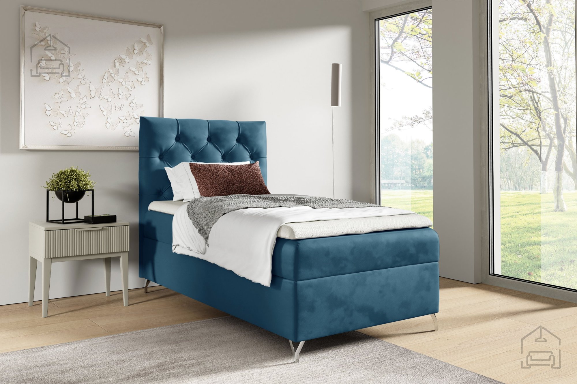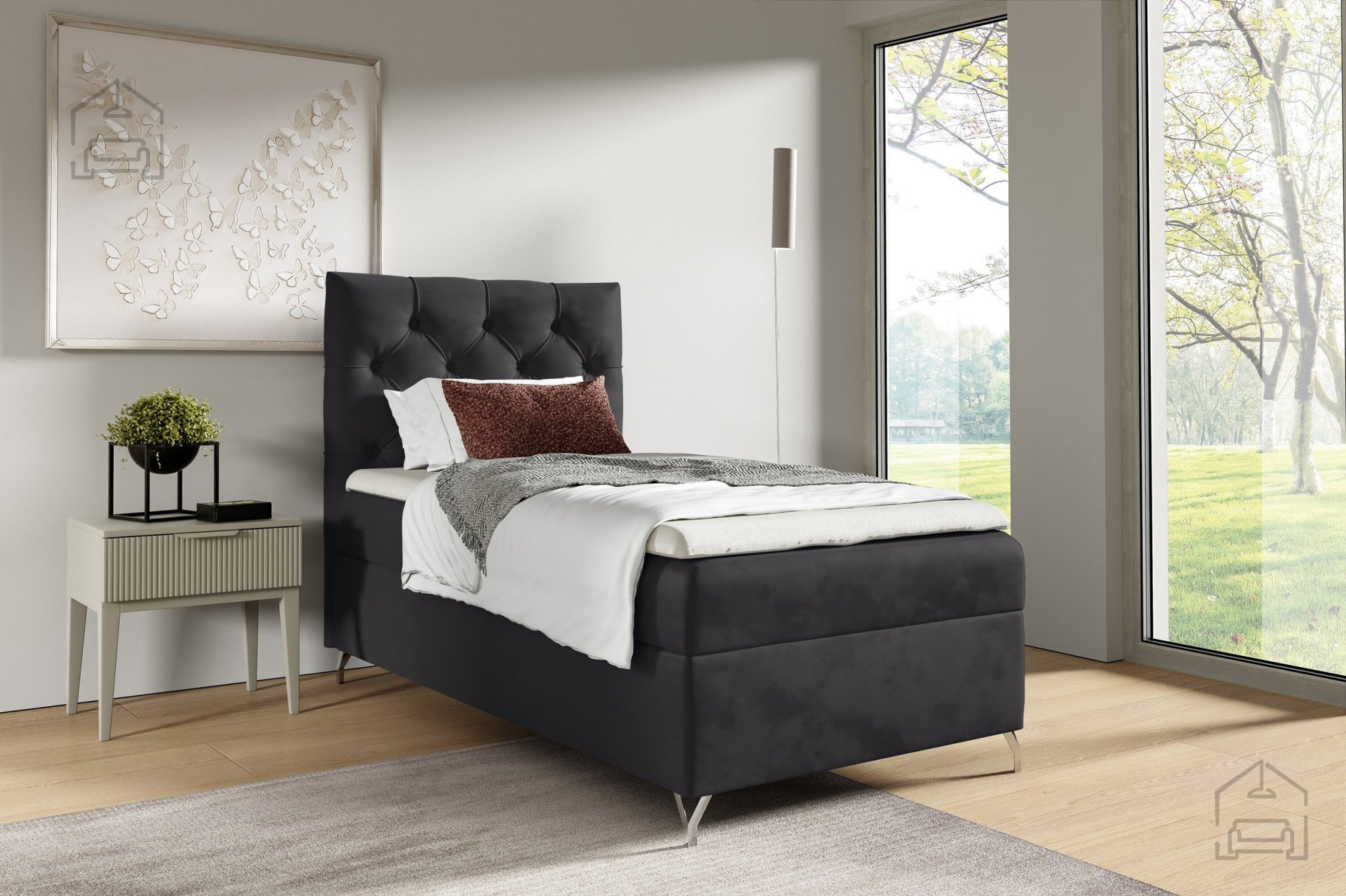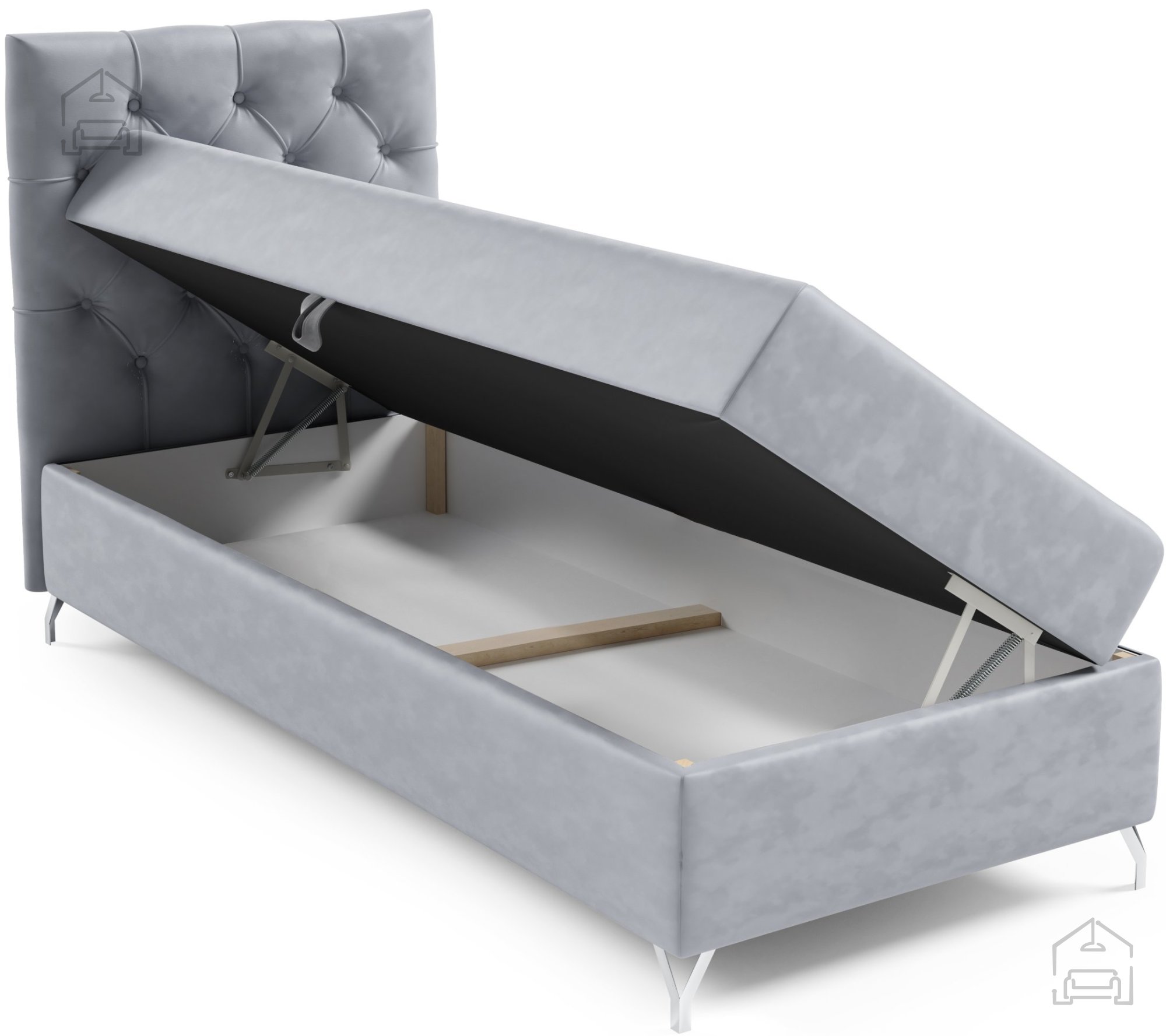 Das gepolsterte Kopfteil ist mit dekorativen Knopfsteppungen versehen, was dem Bett einen Hauch klassischer Eleganz verleiht. Auf dem Foto ist der Stoff Magic Velvet 2234 zu sehen – angenehm im Griff und abriebfest. Silberfarbene Metallfüße runden das Design ab und gewährleisten Stabilität. Ein zusätzlicher Vorteil: Teile des Bettkastens sind ebenfalls mit Stoff bezogen, wodurch das Bett auch bei geöffnetem Stauraum ansprechend aussieht.