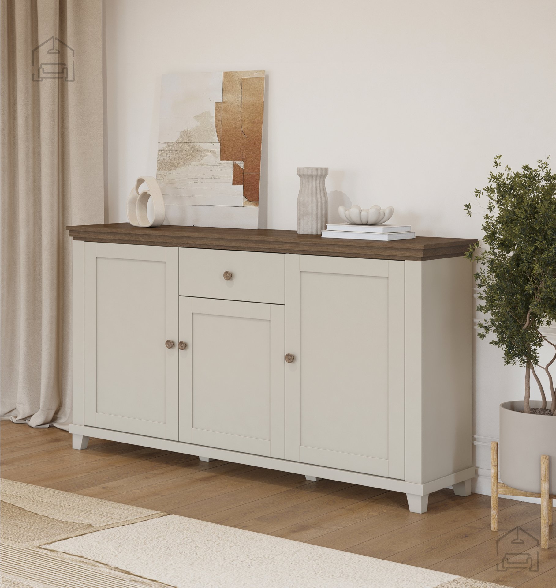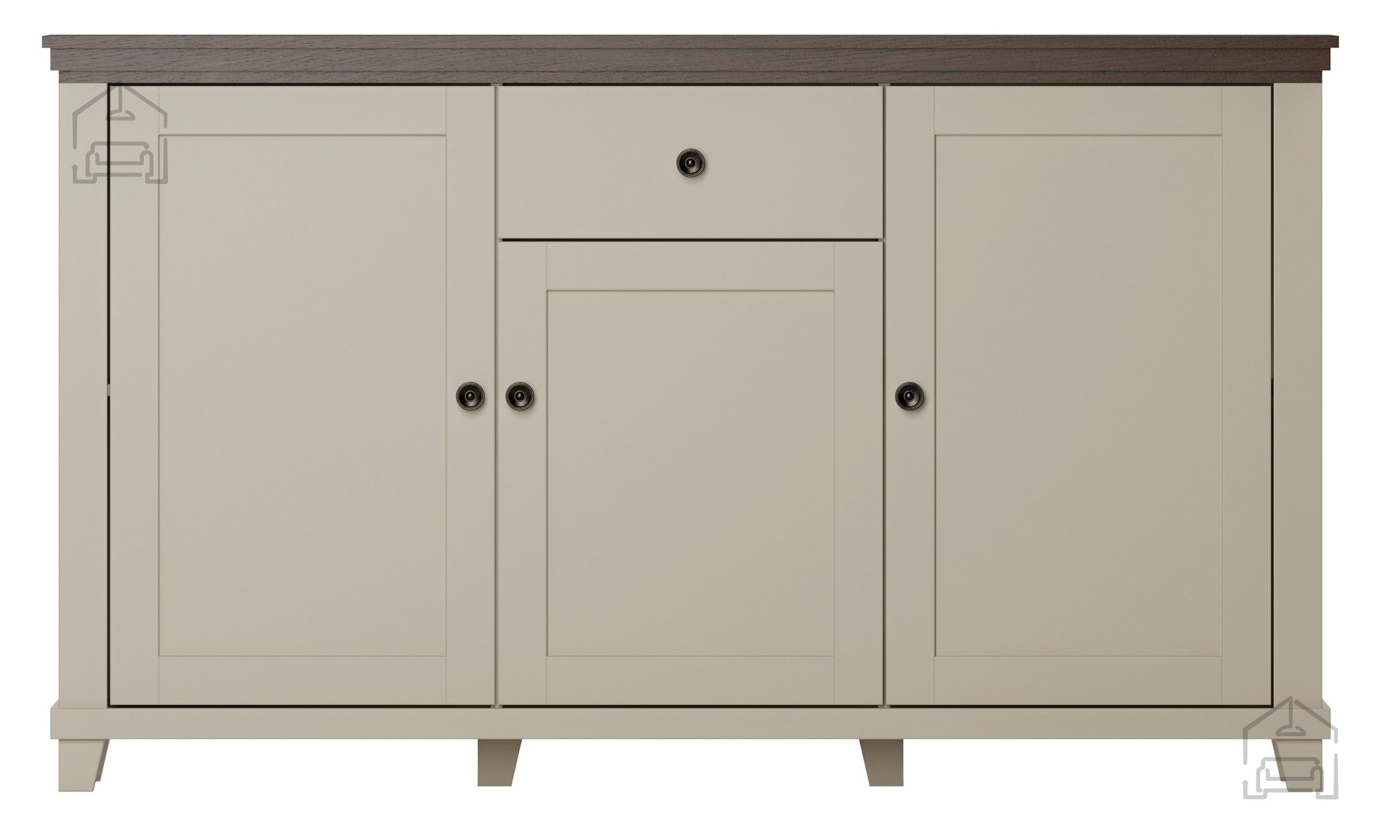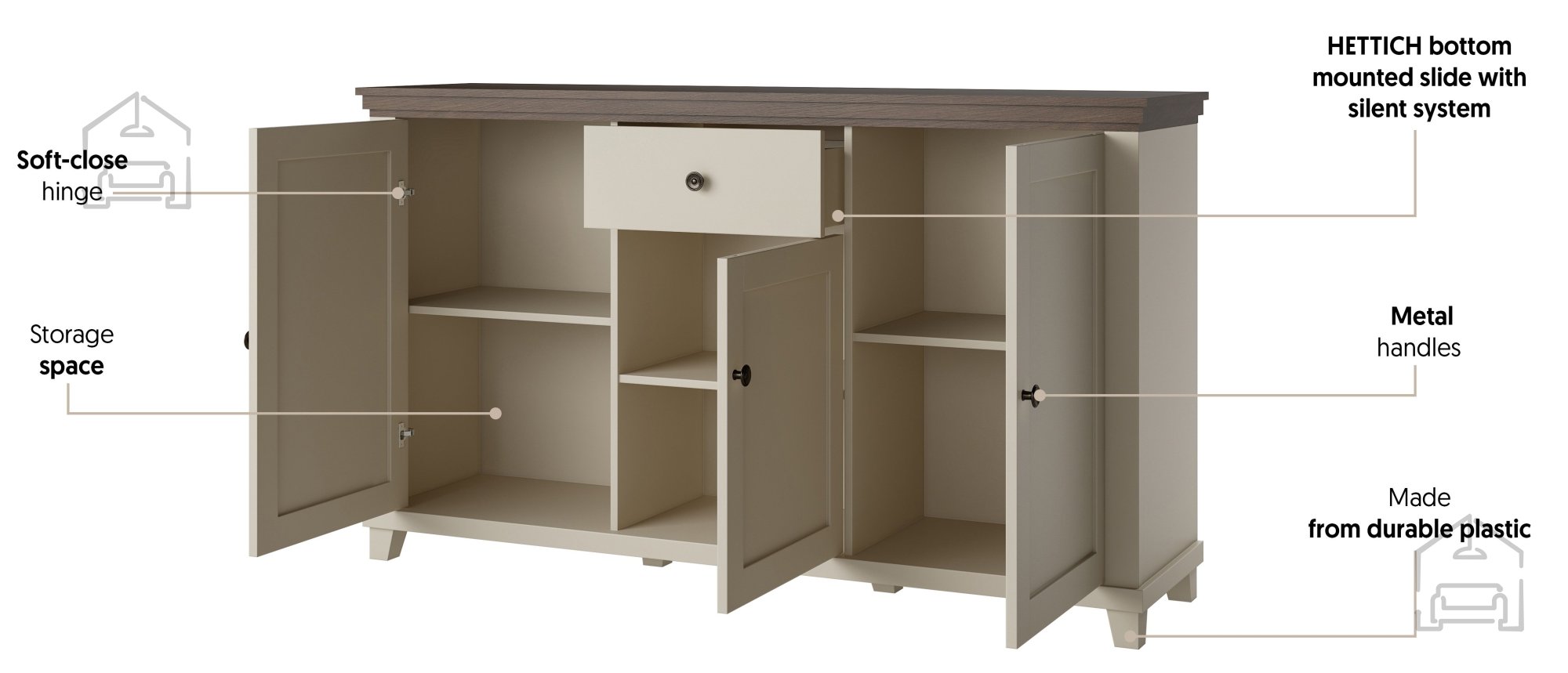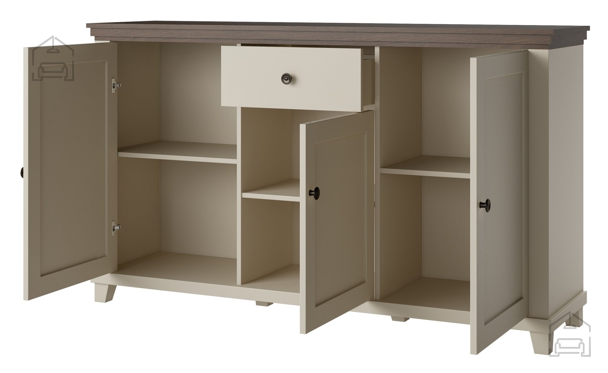 Die Kommode bietet eine clevere Innenaufteilung, die das strukturierte Verstauen verschiedenster Gegenstände ermöglicht. Sie verfügt über drei Türen und eine Schublade, wodurch sich Dokumente, Textilien, Geschirr oder andere Haushaltsutensilien bequem trennen lassen. Geräumige Innenfächer erleichtern die Organisation und sorgen gleichzeitig für ein aufgeräumtes Gesamtbild. Die Schublade lässt sich sanft und leise öffnen, was den täglichen Gebrauch besonders angenehm macht.