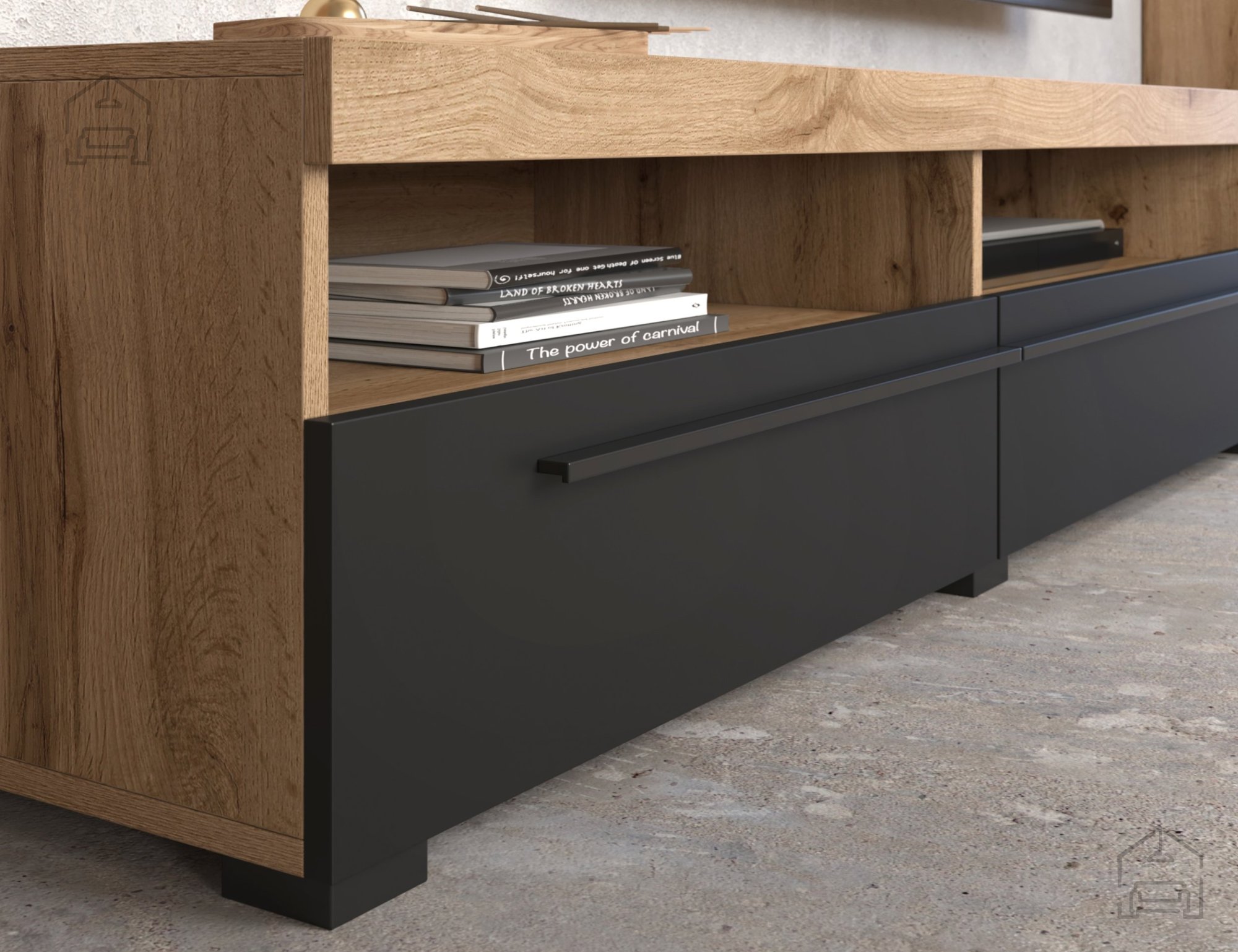 Die Wohnwand Roger bringt mit ihrer Farbkombination aus Wotan-Eiche und mattem Schwarz einen modernen Akzent in jedes Zuhause. Diese Möbelserie überzeugt durch durchdachte Details, hochwertige Materialien und praktische Funktionalität. Ihr minimalistisches Design passt perfekt in moderne Wohnräume und bewahrt gleichzeitig die warme Ausstrahlung von Holz. Gefertigt aus einer laminierten Platte, ist das Möbelstück robust, kratzfest und leicht zu reinigen. Dank der soliden Verarbeitung und der sorgfältigen Ausführung ist die Wohnwand Roger eine ausgezeichnete Wahl für alle, die Wert auf Stil und Alltagstauglichkeit legen.
