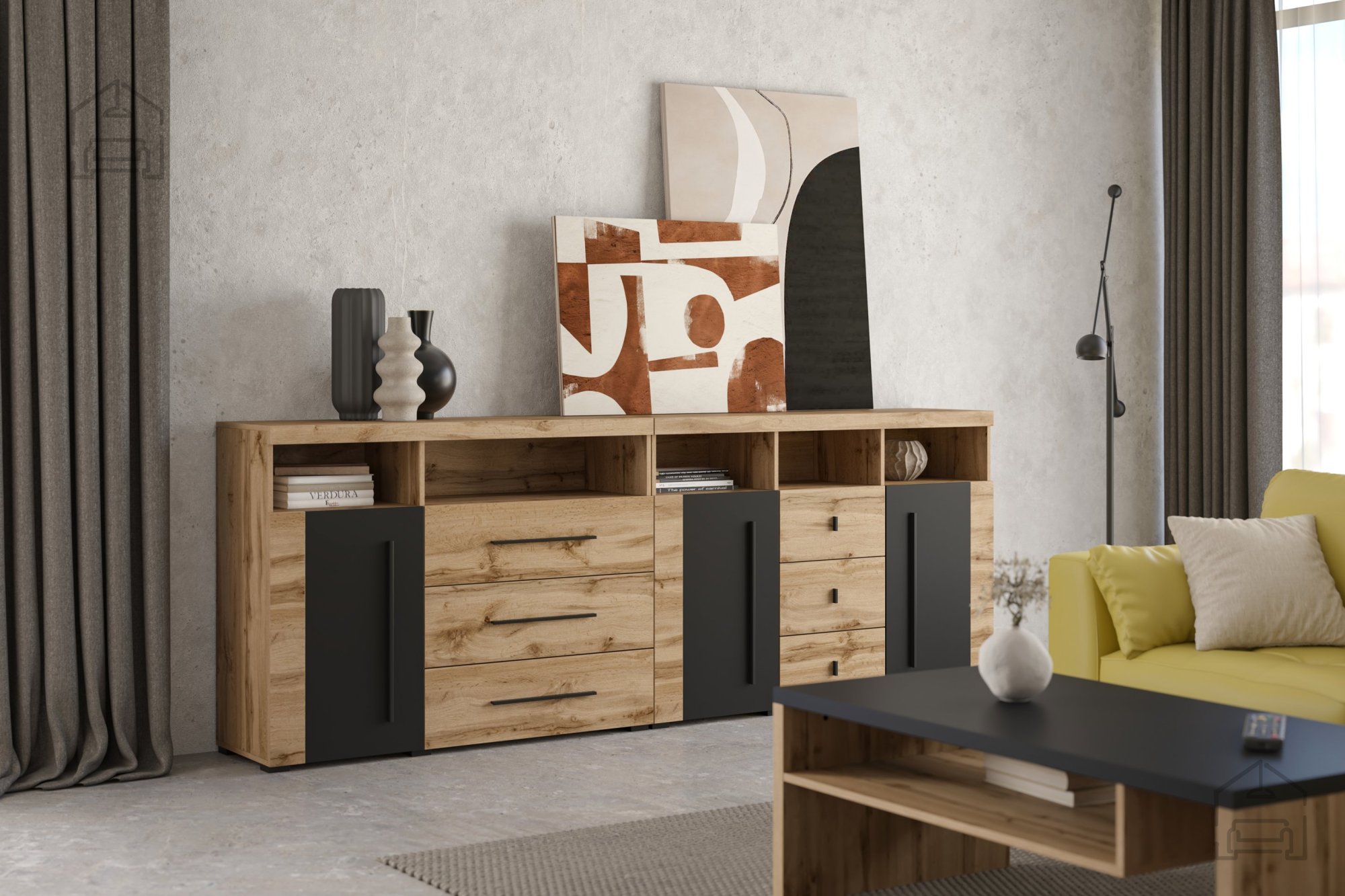 Die Farbkombination Wotan-Eiche/Wotan-Eiche/Schwarz matt erzeugt einen reizvollen Kontrast zwischen der warmen Holzoptik und der edlen Tiefe des Schwarztons. Wotan-Eiche überzeugt mit realistischer Maserung, sanfter Struktur und natürlichen Farbnuancen, die dem Raum eine gemütliche Atmosphäre verleihen. Die matte schwarze Fläche sorgt für ein harmonisches Gleichgewicht und einen modernen, minimalistischen Look. Diese Kombination passt sowohl zu hellen als auch zu dunklen Einrichtungstönen und macht die Kollektion Roger zu einer vielseitigen Wahl – ob für industrielle, skandinavische oder klassische Wohnstile.