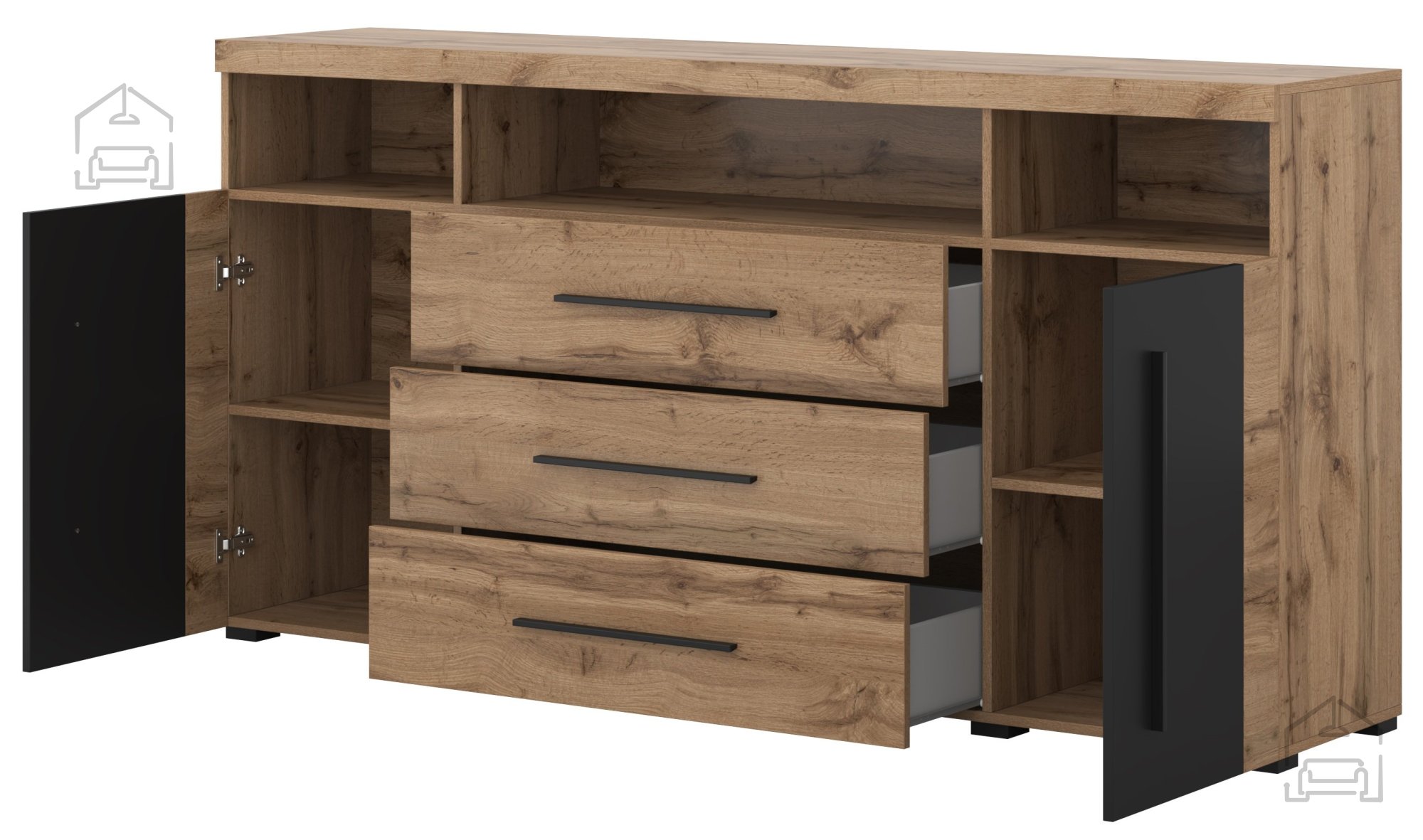 Die Kommode Roger – Helvetia meble ist eine elegante und praktische Lösung für moderne Wohnräume. Mit ihrer Breite von 182 cm und der harmonischen Kombination aus warmem Wotan-Eichen-Dekor und mattschwarzen Fronten schafft sie ein ausgewogenes, zeitgemäßes Erscheinungsbild, das sich mühelos in verschiedene Einrichtungsstile einfügt. Gefertigt aus hochwertiger, laminierter Platte ist sie widerstandsfähig gegen Kratzer und Feuchtigkeit – das sorgt für lange Haltbarkeit und einfache Pflege. Die Kanten sind mit der ABC-Technologie verarbeitet, was sie zusätzlich vor Stößen schützt und dem Möbelstück ein gepflegtes Gesamtbild verleiht.