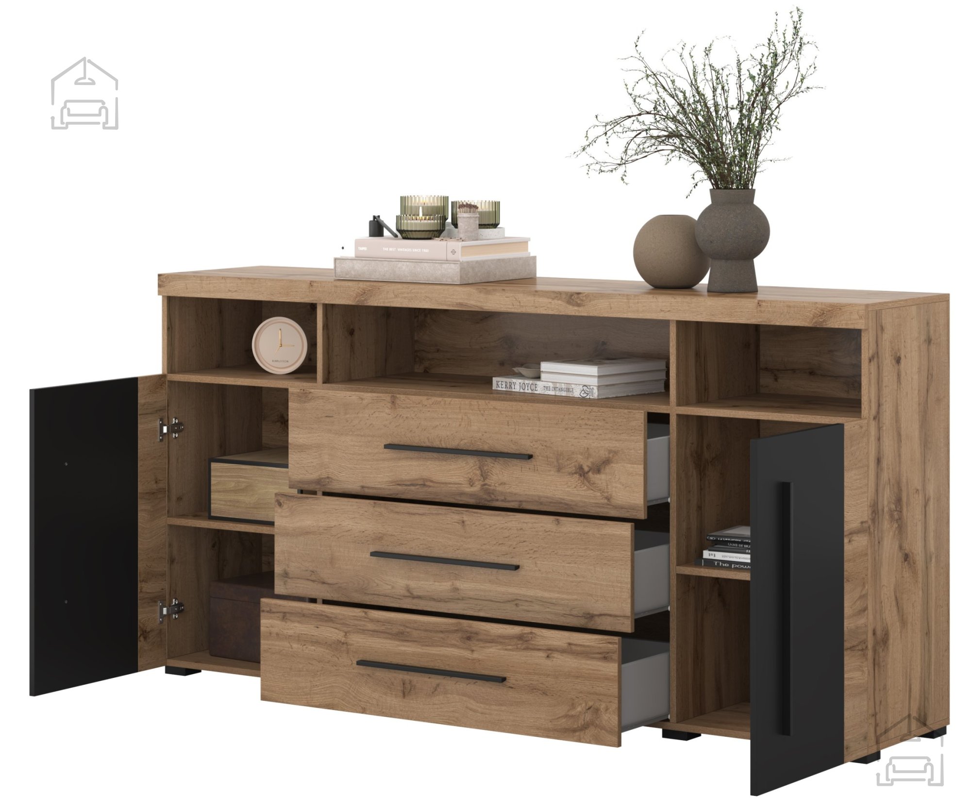 Die Kommode Roger – Helvetia meble vereint Funktionalität, Design und hochwertige Verarbeitung auf harmonische Weise. Sie bietet ausreichend Stauraum und ergänzt moderne Wohnräume mit ihrer zeitlosen Kombination aus Holzoptik und Schwarz. Dank der robusten Materialien und durchdachten Details ist sie ein langlebiges, stilvolles Möbelstück für Ihr Zuhause.