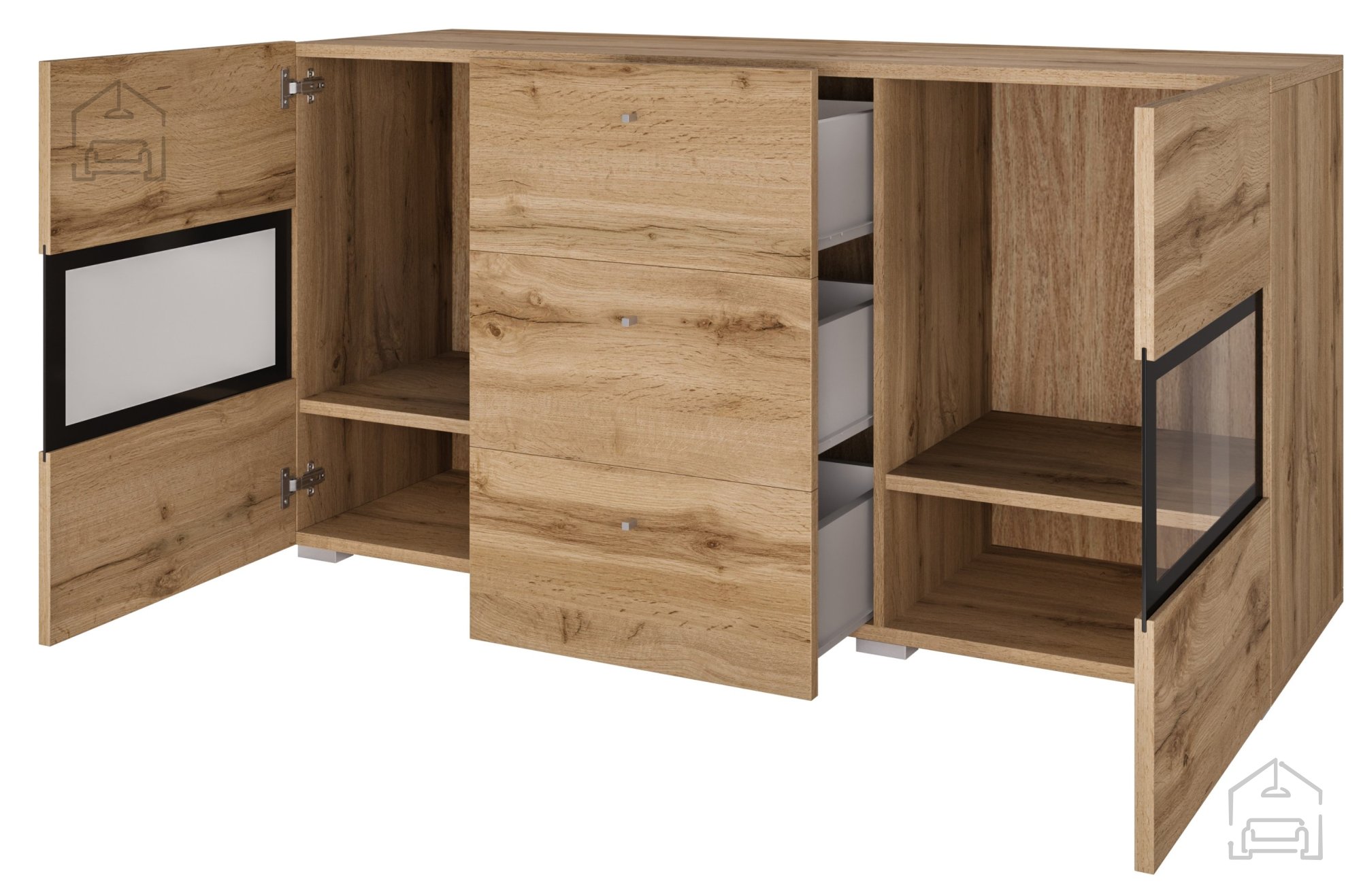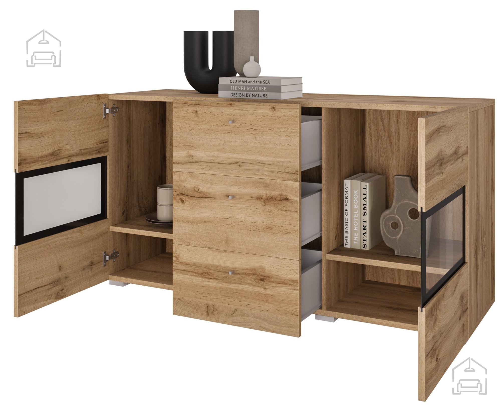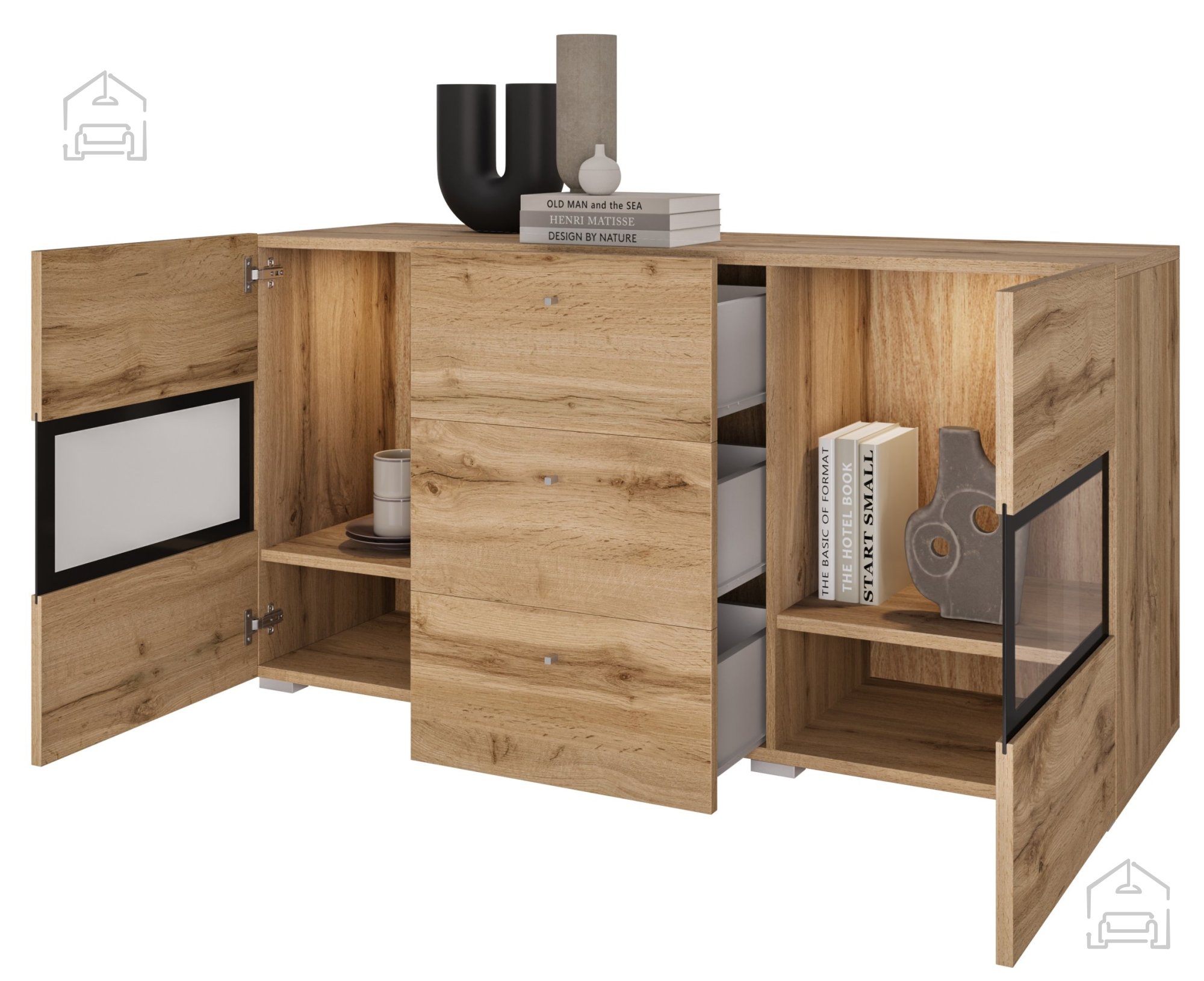 Die teils verglasten Elemente der Kommode sind elegant von einem schwarzen Rahmen eingefasst, was einen schönen Kontrast schafft und das moderne Design betont. Der Glasbereich bietet Platz, um dekorative Stücke, Erinnerungen oder Geschirr wirkungsvoll zu präsentieren. Optional ist gegen Aufpreis eine LED-Beleuchtung erhältlich, mit der Sie eine angenehme Lichtstimmung schaffen und den Inhalt der Vitrine stimmungsvoll hervorheben können. Besonders am Abend kommt dieser Effekt zur Geltung, wenn das Licht sanft die Holzstruktur betont.