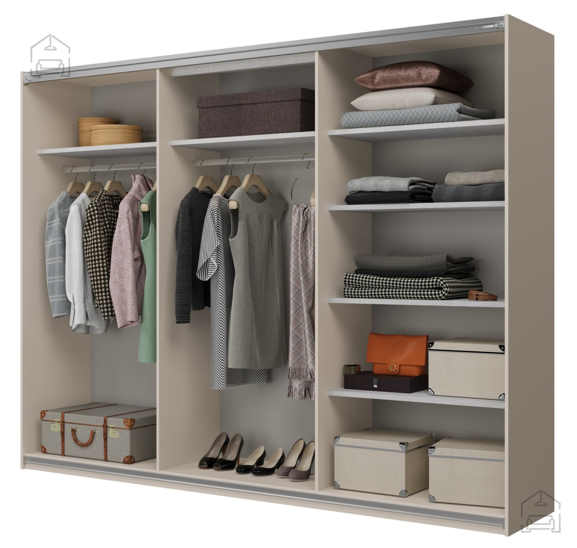 Das Schiebetürsystem ermöglicht ein leises und leichtgängiges Öffnen der Türen – ideal für Räume, in denen man Platz vor dem Schrank sparen möchte. Die dreiteilige Türstruktur sorgt für eine übersichtliche und organisierte Innenaufteilung, sodass man mit einem Handgriff Zugang zu allen Bereichen des Schranks hat, ohne Möbel im Raum verschieben zu müssen.