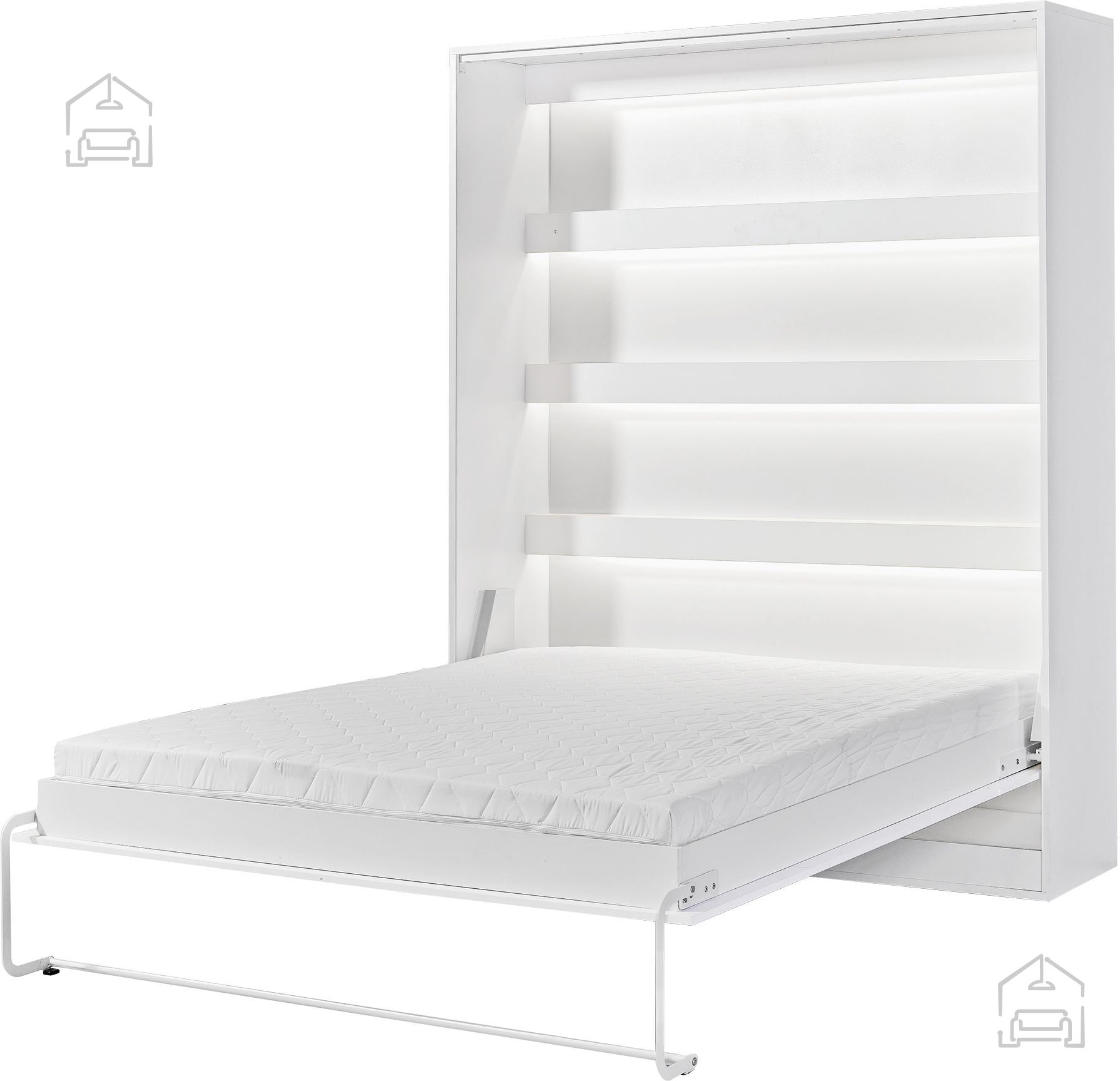 Das vertikale Schrankbett von Domel vereint Komfort und Funktionalität. Im geschlossenen Zustand wirkt es wie ein moderner Schrank, der kaum Platz beansprucht, und geöffnet verwandelt es sich in ein vollwertiges Doppelbett. Der stabile Hebemechanismus und der hochwertige Lattenrost sorgen für eine angenehme und sichere Liegefläche – perfekt für den täglichen Gebrauch. Ideal geeignet für Gästezimmer, Ferienwohnungen oder kompakte Stadtwohnungen.