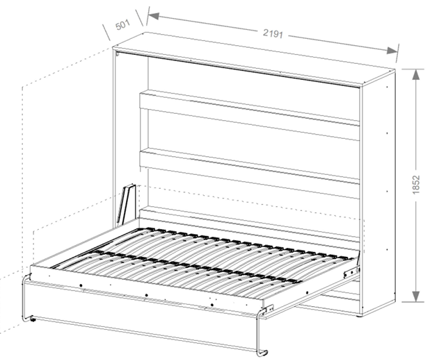Das horizontale Schrankbett Perfect – Domel ist die ideale Wahl für alle, die bequem schlafen und den vorhandenen Platz optimal nutzen möchten. Im geschlossenen Zustand wirkt es wie ein eleganter Schrank mit dezenten Griffen in Weiß oder Schwarz. Geöffnet bietet es eine vollwertige Liegefläche mit Lattenrost – bereit für eine komfortable Matratze. Dank des einfachen Mechanismus eignet sich das Bett auch für den täglichen Gebrauch und nicht nur als Gästebett.