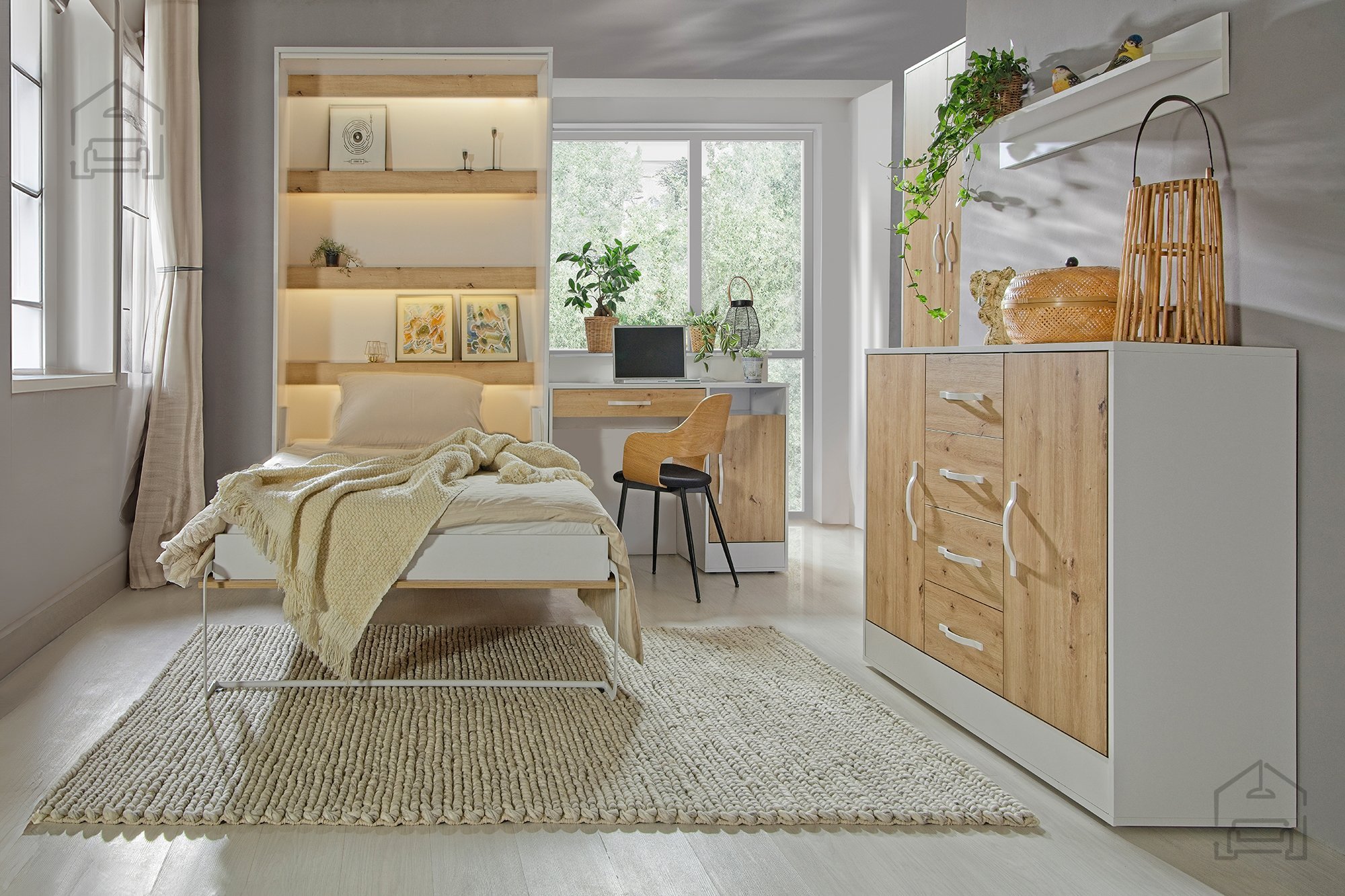Das Kinderzimmer eignet sich für verschiedene Altersstufen und Entwicklungsphasen. Dank des neutralen Farbkonzepts lässt es sich problemlos mit Schreibtischen, Betten oder Kleiderschränken aus derselben Serie oder anderen Kollektionen kombinieren. Die stabile Konstruktion aus Spanplatte ermöglicht einen sicheren Aufbau und eine einfache Montage – ideal auch für kleinere Wohnungen.