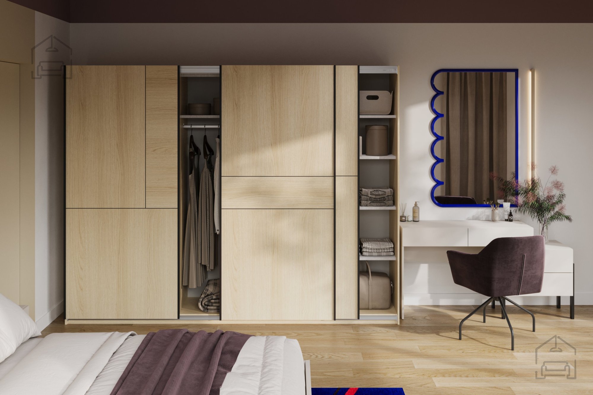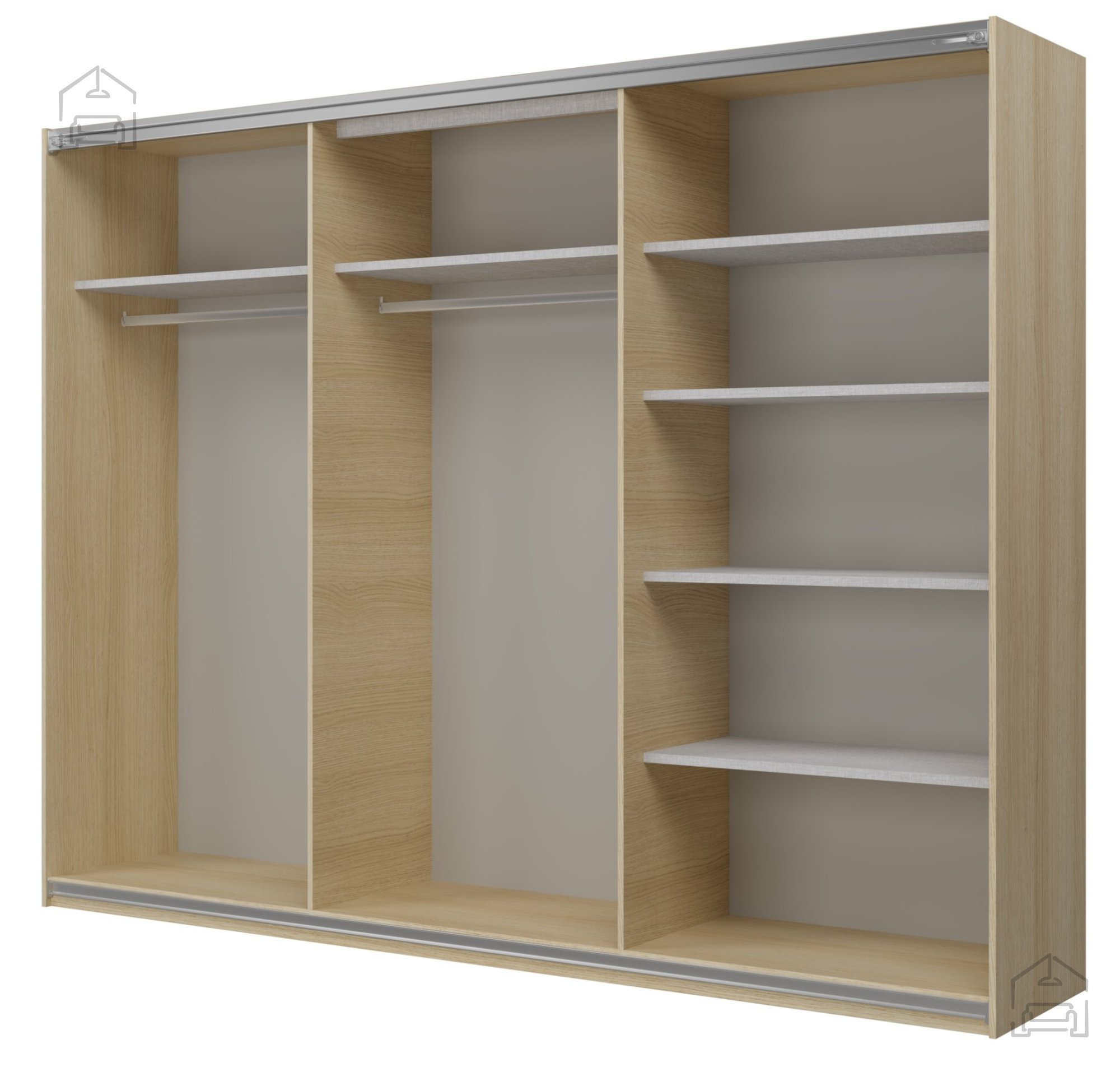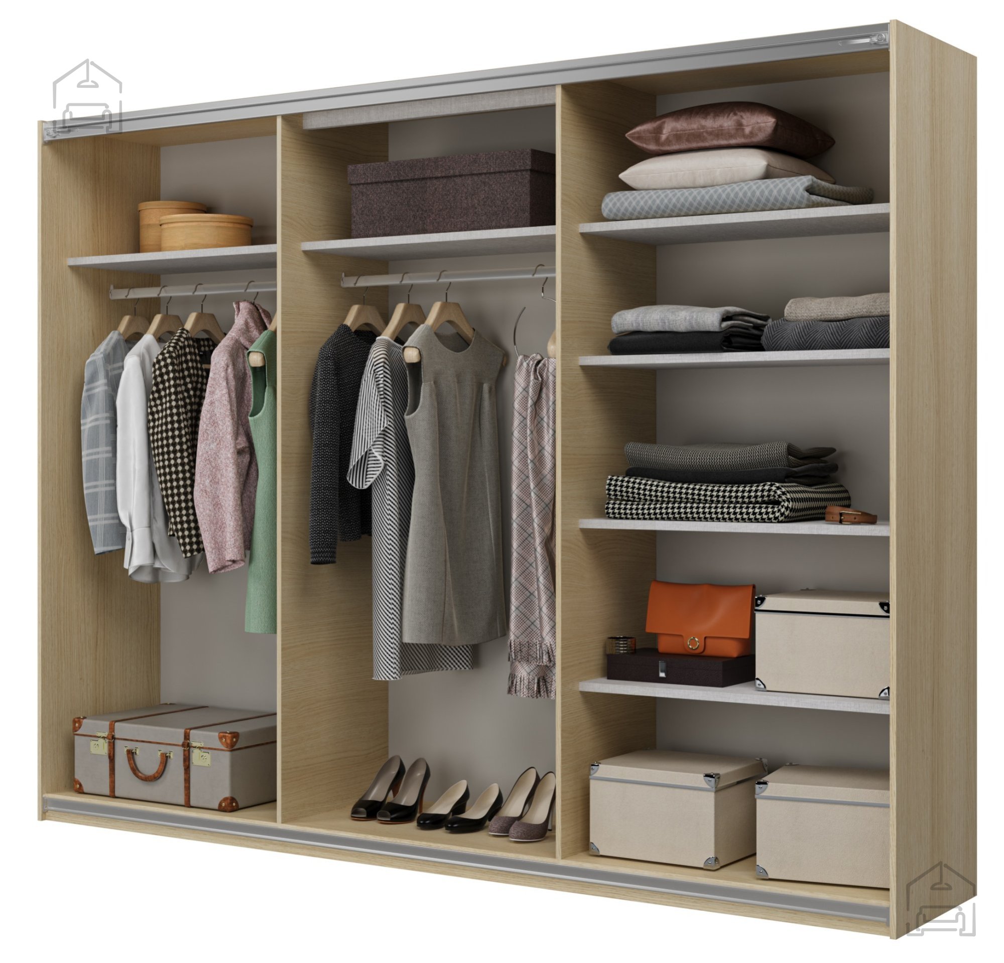 Der Schrank verfügt über drei Schiebetüren, die einen bequemen Zugriff auf den Innenraum ermöglichen, ohne zusätzlichen Platz zum Öffnen zu benötigen. Besonders in kleineren Räumen erweist sich diese Lösung als äußerst praktisch. Der Schiebemechanismus läuft ruhig und gleichmäßig, was den täglichen Gebrauch besonders angenehm macht. Jedes Türblatt bewegt sich auf einer stabilen Führungsschiene, wodurch Verkanten oder Klemmen verhindert wird.