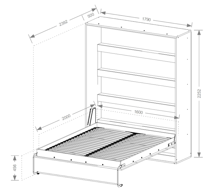 Das gesamte Möbelstück misst 179x239,2x225,2 cm und bietet damit eine komfortable Liegefläche bei optimaler Raumnutzung. Dieses Schrankbett eignet sich besonders gut für Garçonnièren, Jugendzimmer, Arbeitsräume oder Ferienwohnungen, wo jeder Quadratmeter zählt. Zusammengeklappt entsteht ein aufgeräumter, minimalistischer Raum ohne überflüssige Möbel.