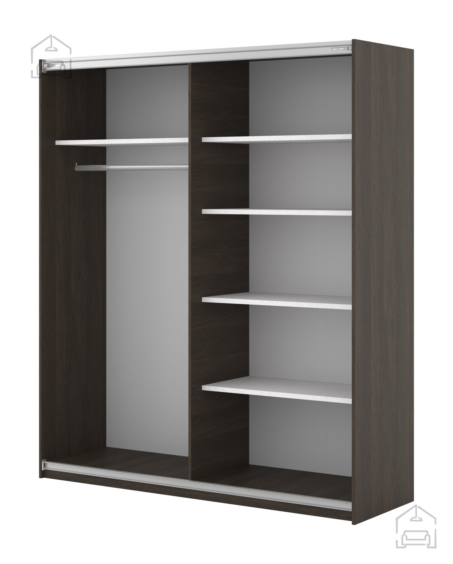 Der Schrank verfügt über zwei Schiebetüren, die eine platzsparende Nutzung ermöglichen, da beim Öffnen kein zusätzlicher Raum benötigt wird. Das Schiebetürsystem ist auf leises und sanftes Gleiten ausgelegt und bietet die Option des Soft-Close-Mechanismus, was die Handhabung angenehmer macht und den Verschleiß reduziert. Diese Ausführung ist ideal für kleinere Räume oder Schlafzimmer, in denen jeder Zentimeter zählt.