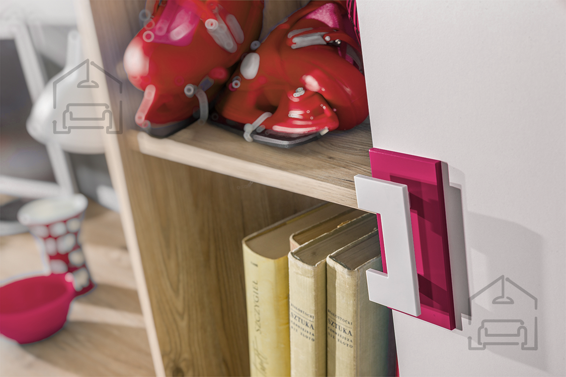 Die Farbkomposition des Zimmers Nico ist sorgfältig abgestimmt. Korpus und Fronten sind in heller Eiche und Weiß gehalten, was dem Raum Helligkeit und Wärme verleiht. Griffe in Weiß und Rosa bringen eine verspielte, kindgerechte Note ein, sodass das Zimmer sowohl zu zarten als auch zu lebhafteren Dekoren passt. Diese Kombination sorgt dafür, dass das Zimmer mit dem Kind mitwachsen kann – von den ersten Jahren an.