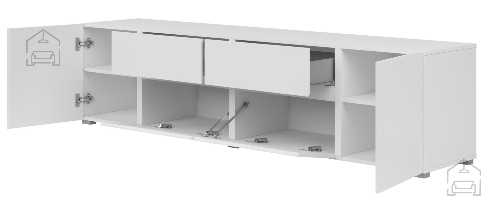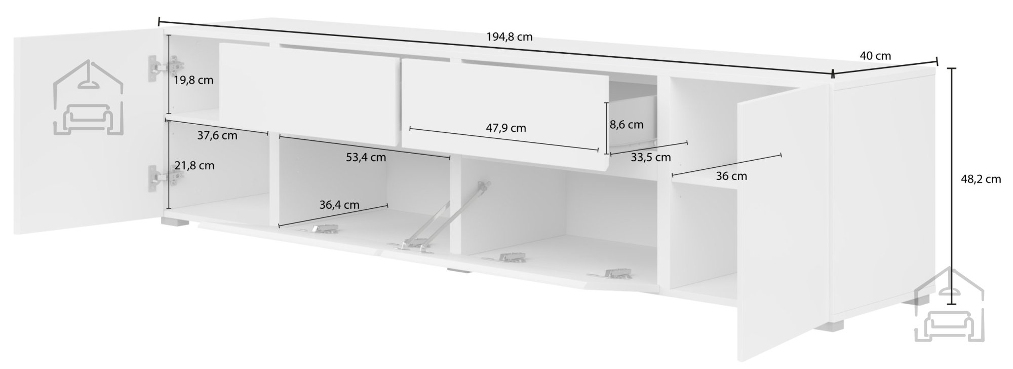 Die Kommode misst 195x40x48 cm und bietet damit genügend Platz für Fernseher verschiedener Größen, ohne wuchtig zu wirken. Ihr Innenraum ist so gestaltet, dass der vorhandene Platz optimal genutzt wird. Sie verfügt über zwei klassische Türen, zwei geräumige Laden und zwei Klapptüren, die einen bequemen Zugriff auf die Ablageflächen oder Multimedia-Geräte ermöglichen.