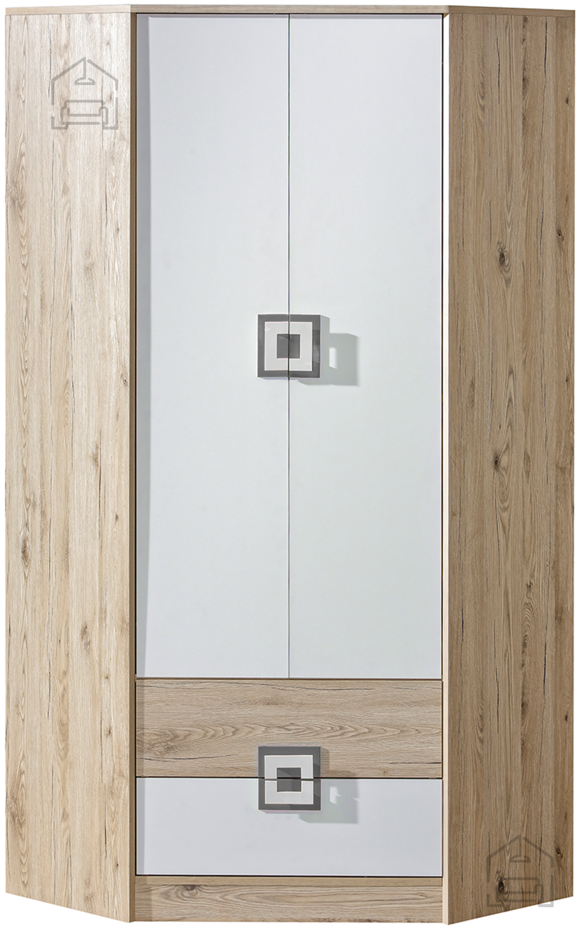 Der Eckkleiderschrank Nico 2 Domel vereint Funktionalität, hochwertige Verarbeitung und ein stimmiges Design. Mit seiner durchdachten Form und der hellen Farbgestaltung bringt er Ordnung und Leichtigkeit in den Raum. Gefertigt aus 16 mm laminierten Spanplatten in Eiche-Weiß-Kombination mit grauen Griffen ist er ein langlebiges, modernes Möbelstück, das viele Jahre Freude bereitet. Mit den Maßen 87 × 87 × 190 cm lässt er sich perfekt in die Raumecke integrieren – eine ideale Wahl für alle, die eine ästhetische und platzsparende Aufbewahrungslösung suchen.