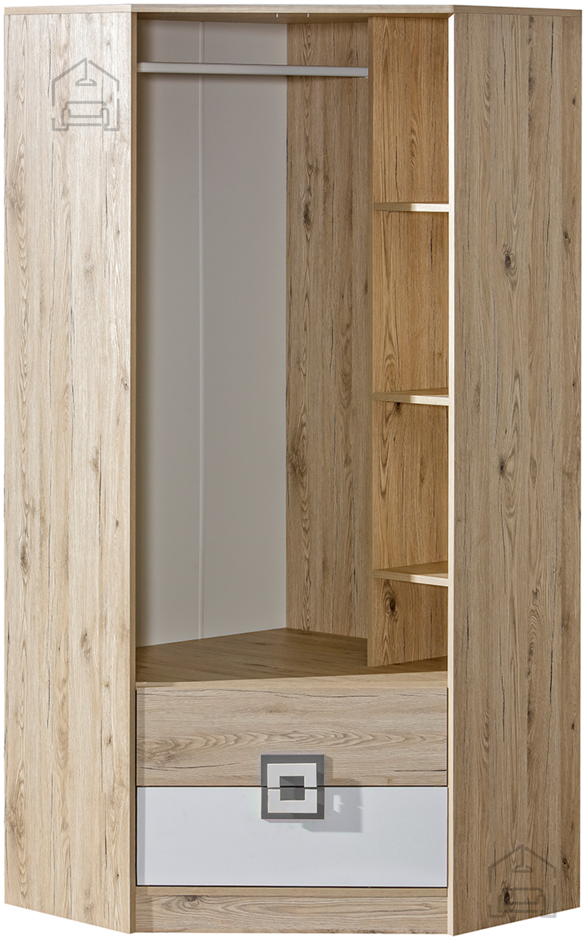 Der Eckkleiderschrank Nico 2 ist eine praktische Lösung für alle, die jeden Zentimeter ihres Schlafzimmers, Vorzimmers oder Kinderzimmers optimal nutzen möchten. Gefertigt wird er in der Fabrik Domel in Polen – das steht für präzise Verarbeitung und hochwertige Oberflächen. Dank seiner cleveren Eckform passt sich der Schrank ideal an den Raum an und bietet dabei überraschend viel Stauraum. Die warme Farbkombination aus hellem Eichen-Dekor und Weiß mit grauen Griffakzenten sorgt für ein modernes, zugleich wohnliches Erscheinungsbild, das sich harmonisch in verschiedene Einrichtungsstile einfügt.