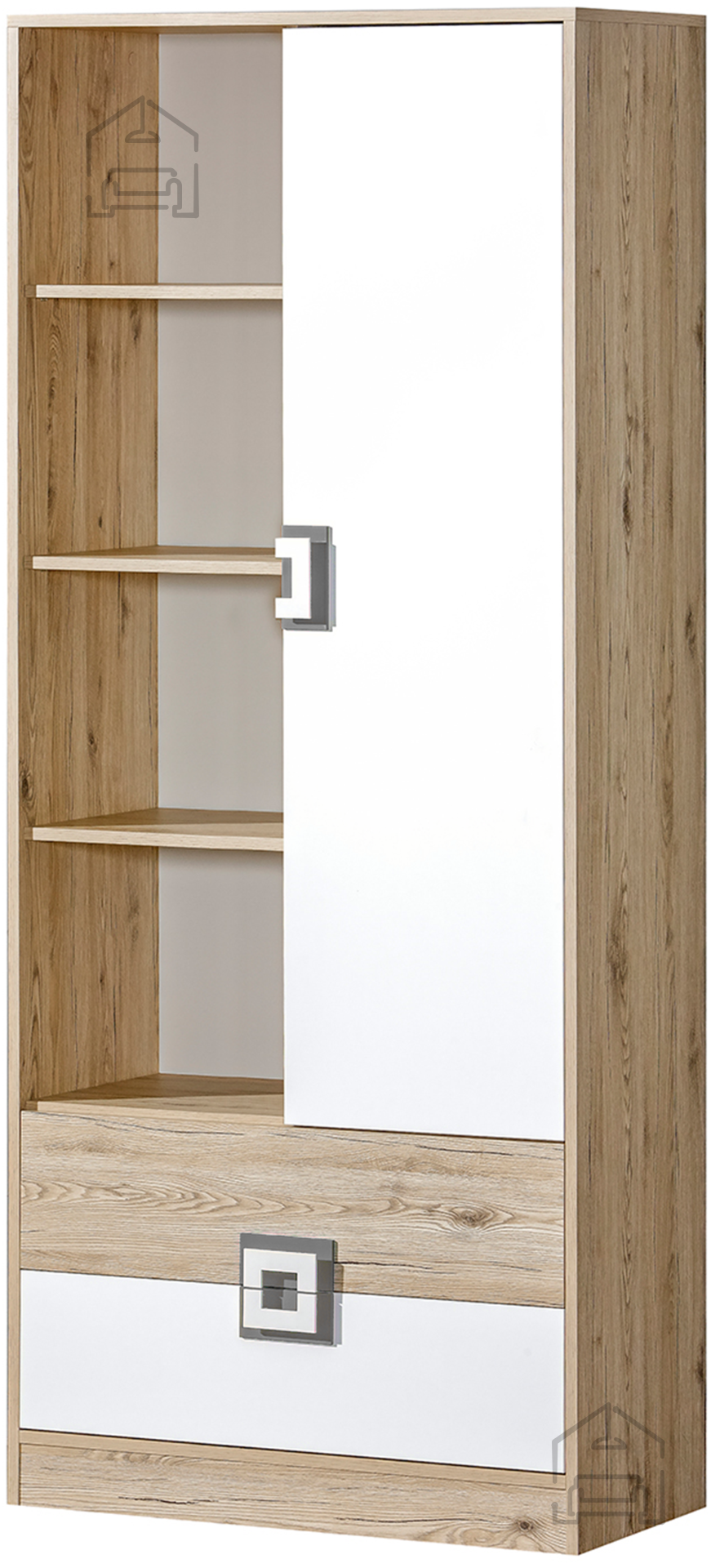 Das Design des Regals Nico 4 lebt vom spannenden Kontrast zwischen hellem Eichenholz und den neutralen Tönen von Weiß und Grau. Diese Kombination vermittelt Wärme und bleibt gleichzeitig modern – ideal für klassische wie auch minimalistische Wohnstile. Die melaminbeschichtete Oberfläche zeigt eine natürliche Holzstruktur, die die Eichenoptik authentisch nachbildet und dem Raum eine gemütliche Note verleiht. Weiße und graue Akzente an Griffen und Elementen sorgen für optische Abwechslung und Leichtigkeit.