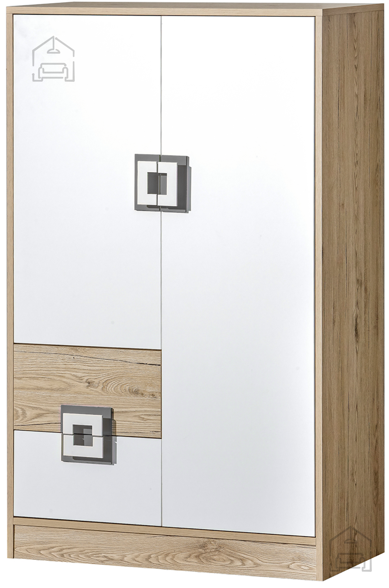 Gestaltet ist die Kommode in einer zweifarbigen Kombination aus heller Eiche und Weiß, die jedem Raum Helligkeit und eine warme Atmosphäre verleiht. Diese Farbgestaltung harmoniert mit vielen Einrichtungsstilen – vom skandinavisch Schlichten bis zum modern Urbanen. Griffe in Weiß und Grau setzen dezente Akzente und unterstreichen die klaren Linien sowie den modernen Charakter der Nico 7.