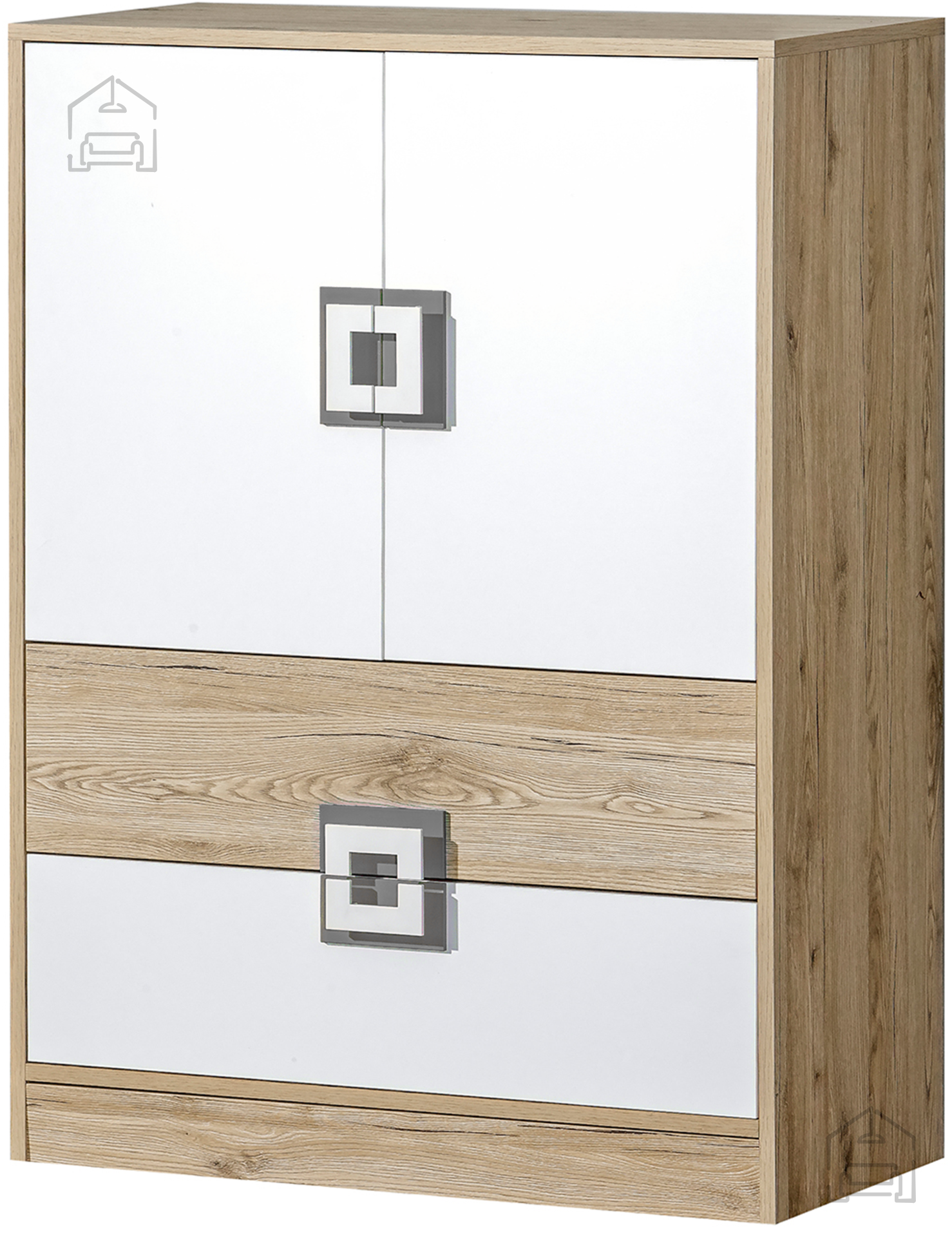 Die Kombination aus hellem Eichen-Dekor und weißen sowie grauen Griffen verleiht der Kommode Nico 9 einen angenehmen Kontrast. Der warme Holzton sorgt für Behaglichkeit, während die hellen Akzente einen frischen, modernen Touch hinzufügen. Dank dieser Farbgestaltung lässt sich die Kommode leicht mit verschiedenen Bodenbelägen, Wandfarben und Möbeln kombinieren. Sie passt sowohl ins Wohnzimmer als auch ins Schlafzimmer, den Vorraum oder das Kinderzimmer – überall dort, wo Sie Ordnung und ein stimmiges Ambiente wünschen.