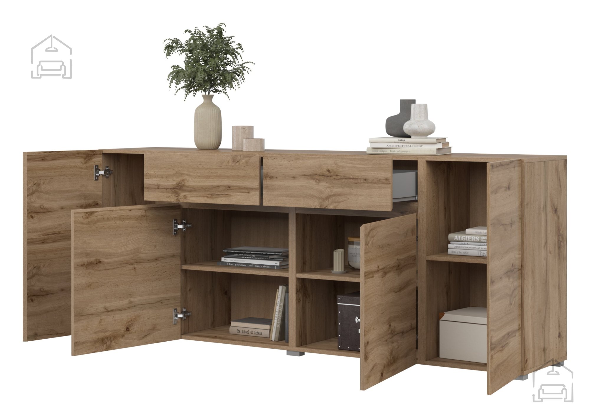 Mit vier Türen und zwei Schubladen bietet die Kommode reichlich Stauraum. Das durchdachte Innenleben ermöglicht eine übersichtliche Aufbewahrung – ob für Dokumente, Textilien, Geschirr oder Dekoration. Der Push-to-Open-Mechanismus ohne Griffe unterstreicht das minimalistische Erscheinungsbild und sorgt für ein müheloses Öffnen von Türen und Schubladen. Diese moderne Lösung erlaubt eine leise und angenehme Handhabung und betont die klaren Linien und geometrische Formgebung der Kommode.