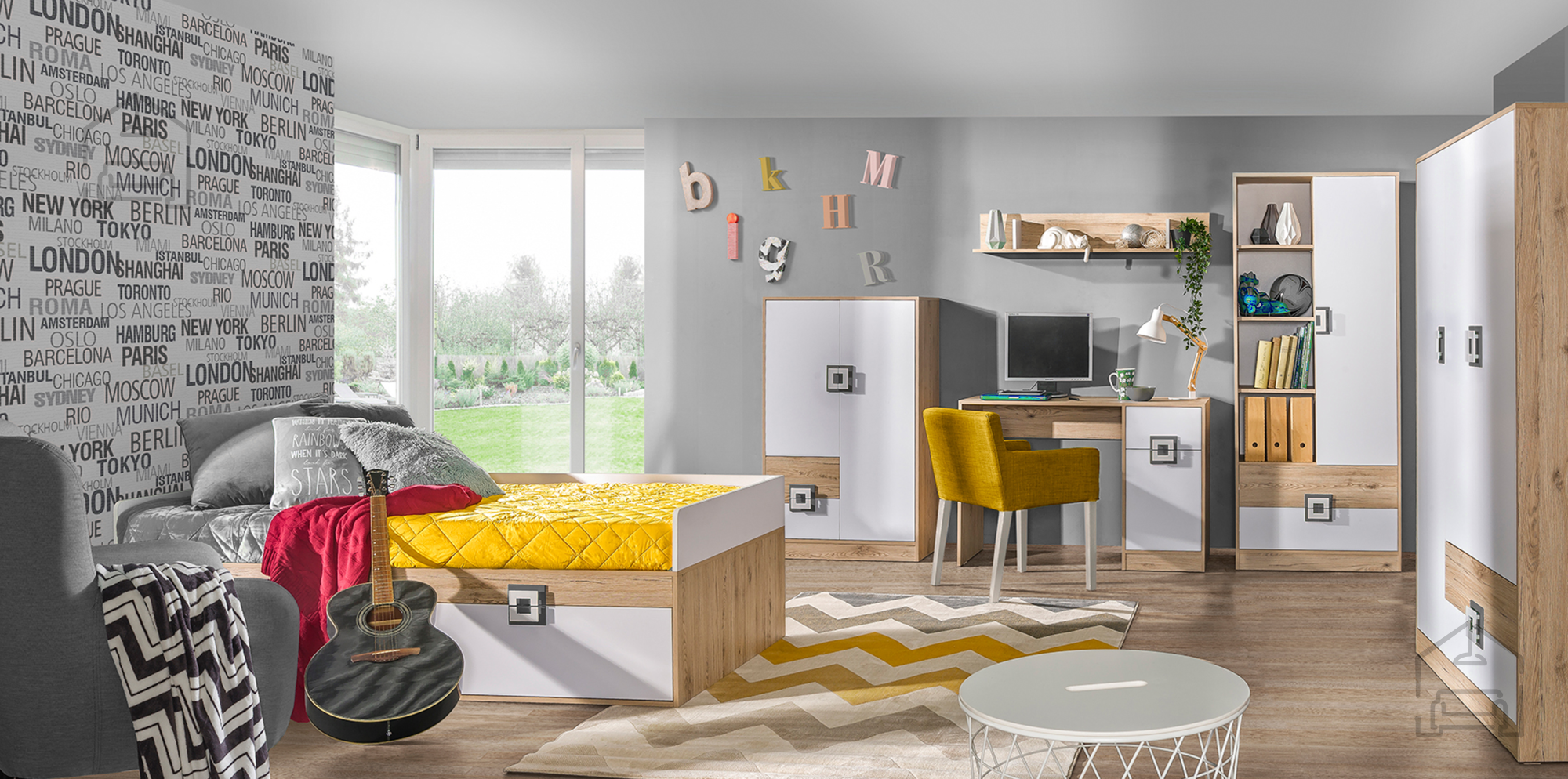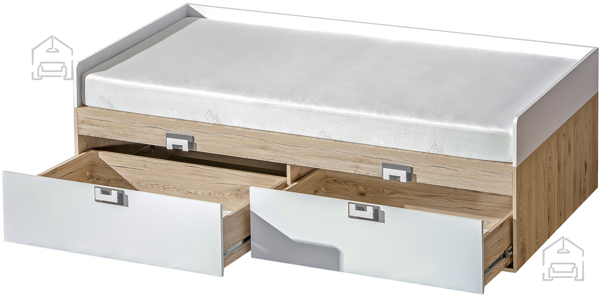 Das Kinderbett Nico 14 der Marke Domel ist für moderne Kinder- und Jugendzimmer konzipiert, in denen Funktionalität und ansprechendes Design harmonisch ineinandergreifen. Die Kombination aus hellem Eichenholzdekor und grauen Details verleiht dem Bett eine warme, freundliche Ausstrahlung, die sich leicht mit unterschiedlichen Einrichtungsstilen kombinieren lässt. Gefertigt ist es aus einer hochwertigen laminierten Spanplatte mit 16 mm Stärke, was für Stabilität, Langlebigkeit und einfache Pflege sorgt. Die Oberfläche ist kratzfest und pflegeleicht – ein klarer Vorteil im Kinderzimmer.