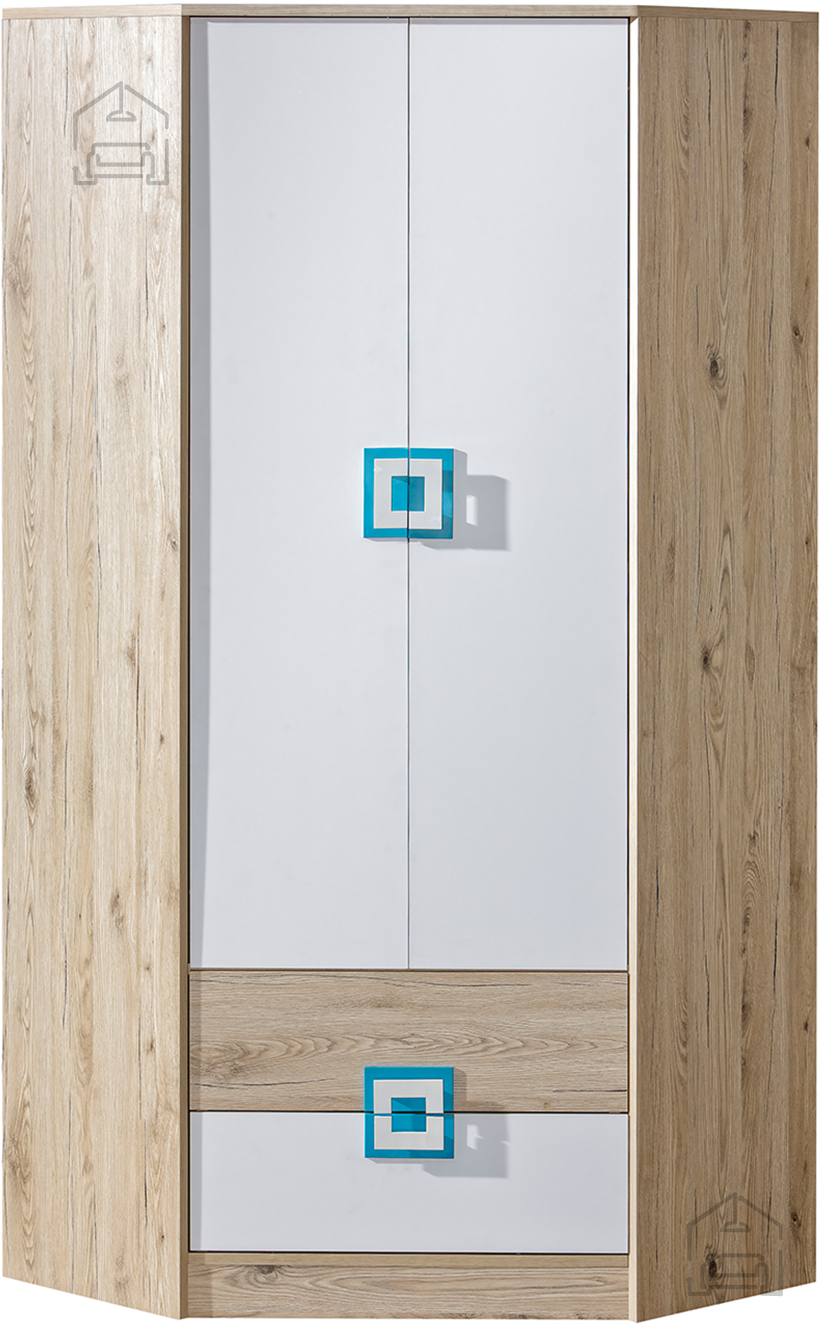 Der Eckkleiderschrank Nico 2 – Eiche/Türkis ist eine praktische Lösung für jedes Zuhause, in dem Platzersparnis und ein ansprechendes Design gleichermaßen wichtig sind. Gefertigt aus hochwertiger, 16 mm starker, laminierten Spanplatte überzeugt er durch Stabilität, Langlebigkeit und einfache Pflege. Die Kombination aus heller Eiche und Weiß mit türkisfarbenen Griffakzenten sorgt für einen modernen, frischen Look, der sich harmonisch in verschiedene Einrichtungsstile – vom skandinavischen bis zum minimalistischen – einfügt.