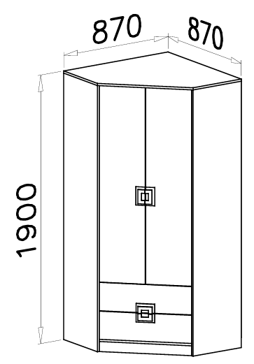Als Eckmodell konzipiert, nutzt der Schrank den vorhandenen Raum optimal aus. Mit den Maßen 87 x 87 x 190 cm bietet er großzügigen Stauraum, ohne zu viel Bodenfläche zu beanspruchen. Diese Form eignet sich besonders gut für kleinere Räume, Kinderzimmer oder Vorzimmer, wo jeder Zentimeter zählt. Die Platzierung in der Ecke schafft einen harmonischen Übergang zwischen den Wänden und vermittelt ein Gefühl von Ordnung und Weite.