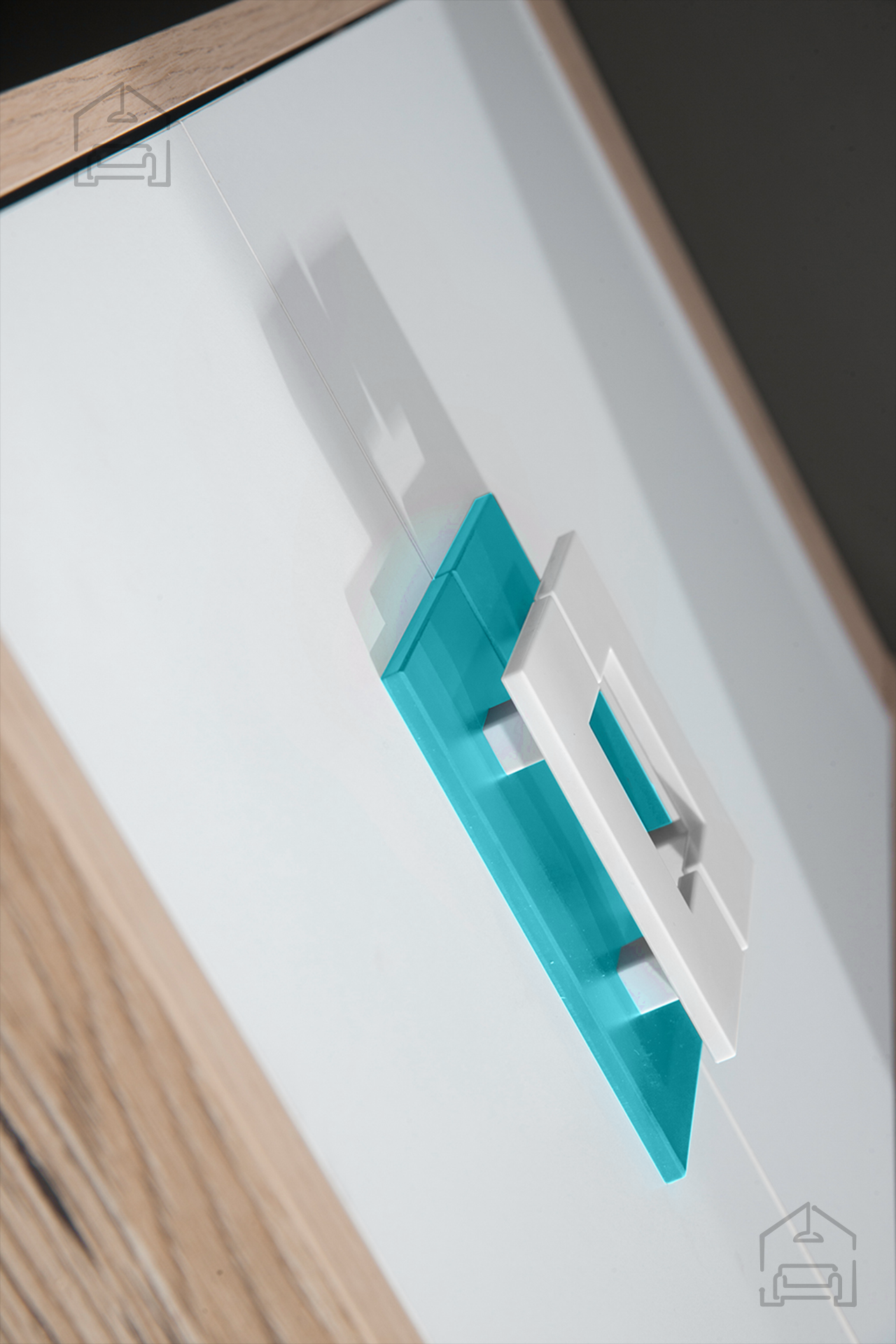 Gefertigt aus einer laminierten Spanplatte mit 16 mm Stärke, die für ihre Robustheit, Kratzfestigkeit und Pflegeleichtigkeit bekannt ist. Die glatte Laminatoberfläche lässt sich mühelos reinigen und behält lange ihr gepflegtes Aussehen. Die Farbkombination aus heller Eiche und Weiß wirkt warm und freundlich, während die türkisfarbenen Griffe einen verspielten Akzent setzen – ganz im Stil moderner Einrichtungstrends. Dank dieser Farbgestaltung lässt sich der Schrank wunderbar mit anderen Holz- oder Farbmöbeln kombinieren.
