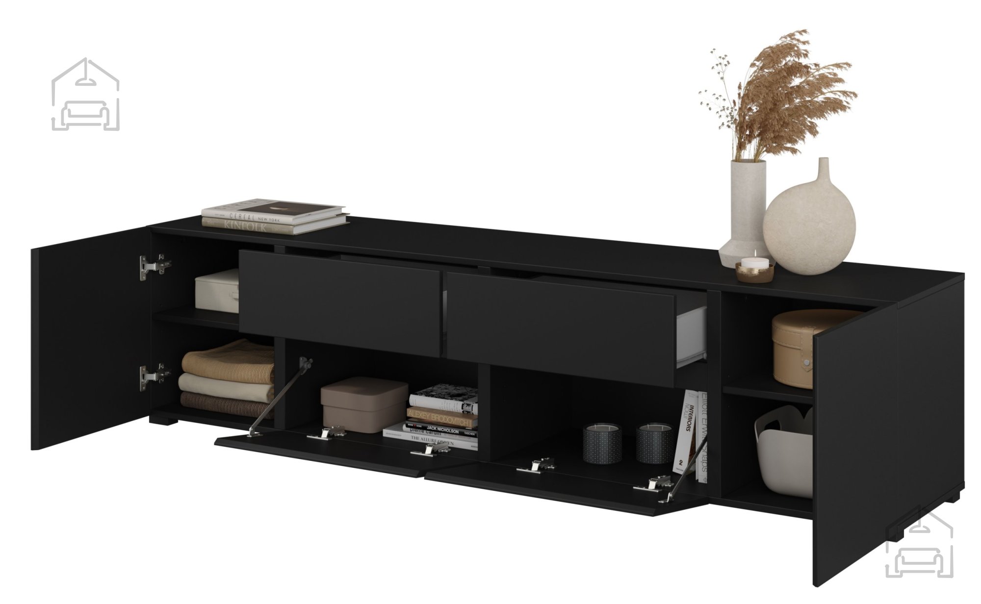 Mit den Maßen 195x40x48 cm bietet die Kommode eine gut strukturierte Innenaufteilung: zwei klassische Türfächer, zwei Schubladen und zwei Klapptüren. Diese Kombination schafft ausreichend Stauraum für Multimedia-Geräte, Kabel, Fernbedienungen und andere Utensilien, während die klare Linienführung erhalten bleibt. Das grifffreie Öffnungssystem ermöglicht eine sanfte, leise Bedienung und unterstreicht den minimalistischen Charakter des Möbels.