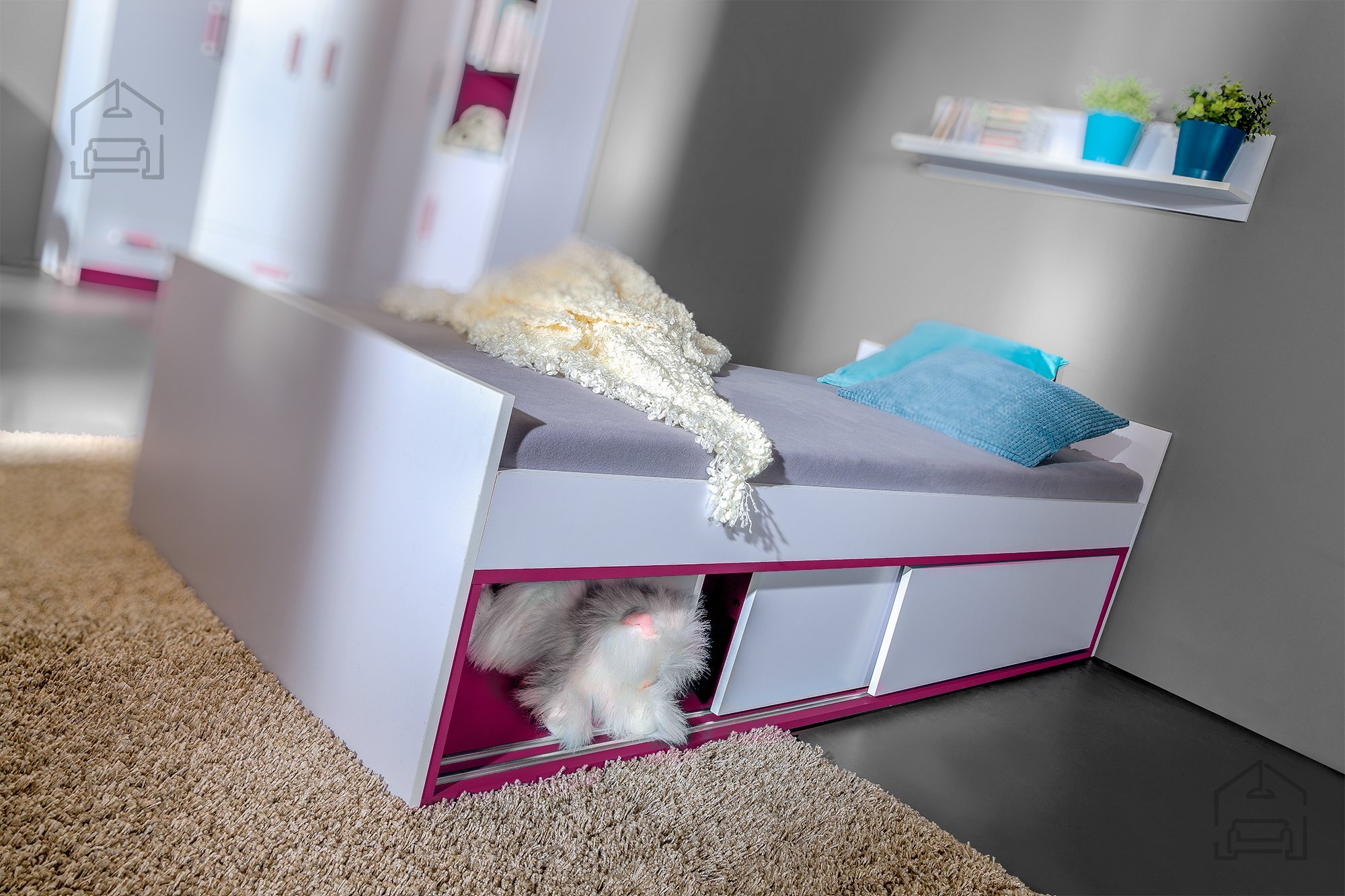 Die Kombination aus Weiß und Rosa schafft einen angenehmen Kontrast, der dem Raum Helligkeit und Wärme verleiht. Weiß lässt den Raum größer wirken, während die rosafarbenen Akzente eine spielerische, kindgerechte Note hinzufügen. Die rosa Griffe aus Kunststoff fühlen sich angenehm an und sind gleichzeitig stabil genug für den täglichen Gebrauch. Zusammengenommen verleihen diese Elemente den Möbeln einen modernen Charakter, der sich leicht mit unterschiedlichen Deko-Accessoires ergänzen lässt.