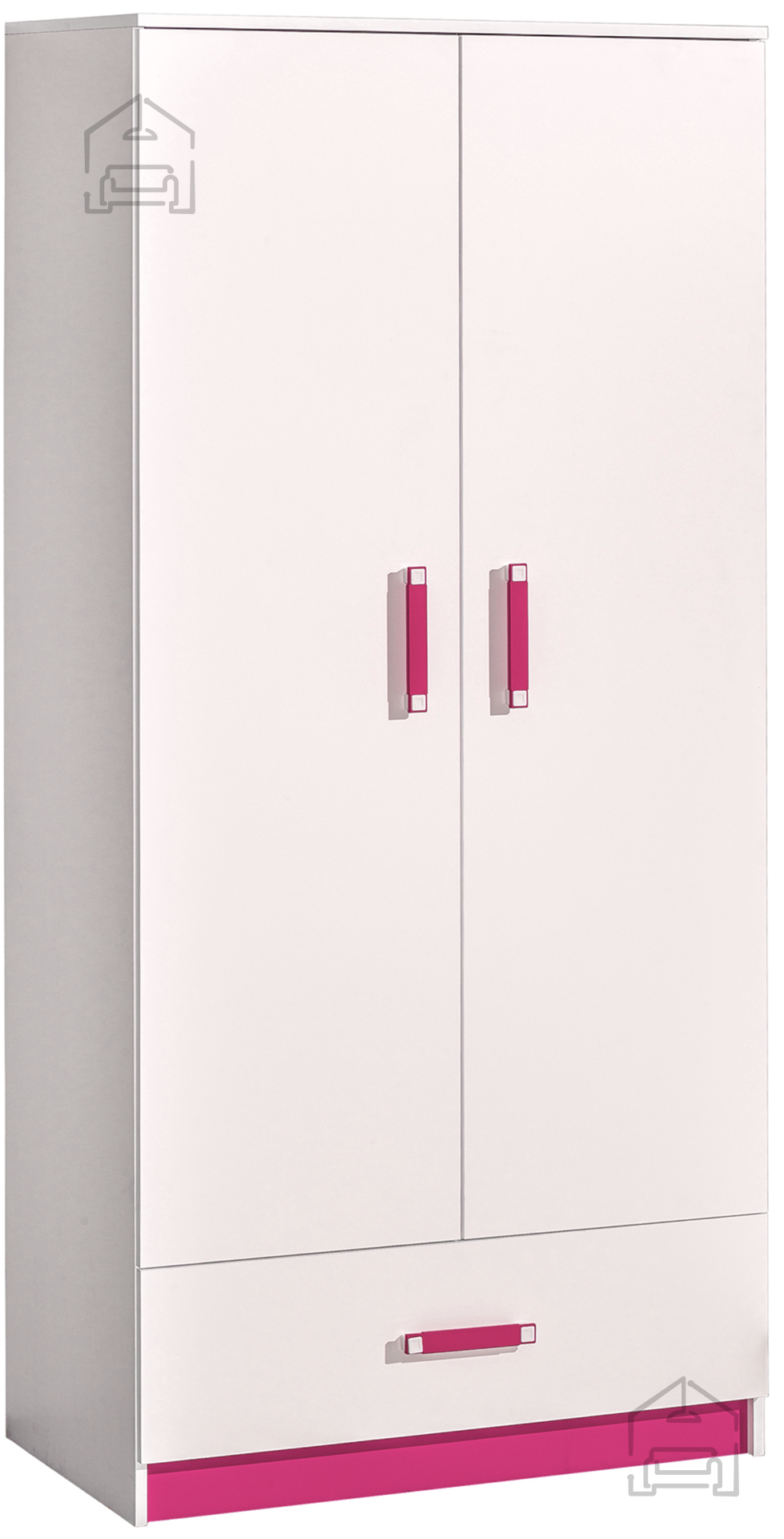 Die weiß-rosafarbene Ausführung verleiht dem Schrank Leichtigkeit und einen spielerischen Charakter. Rosafarbene Griffe aus robustem Kunststoff runden das Design ab und ermöglichen ein bequemes Öffnen der Türen. Diese Farbkombination lässt sich gut mit anderen Möbelstücken der Trafiko-Serie oder mit neutralen Tönen im Raum kombinieren.