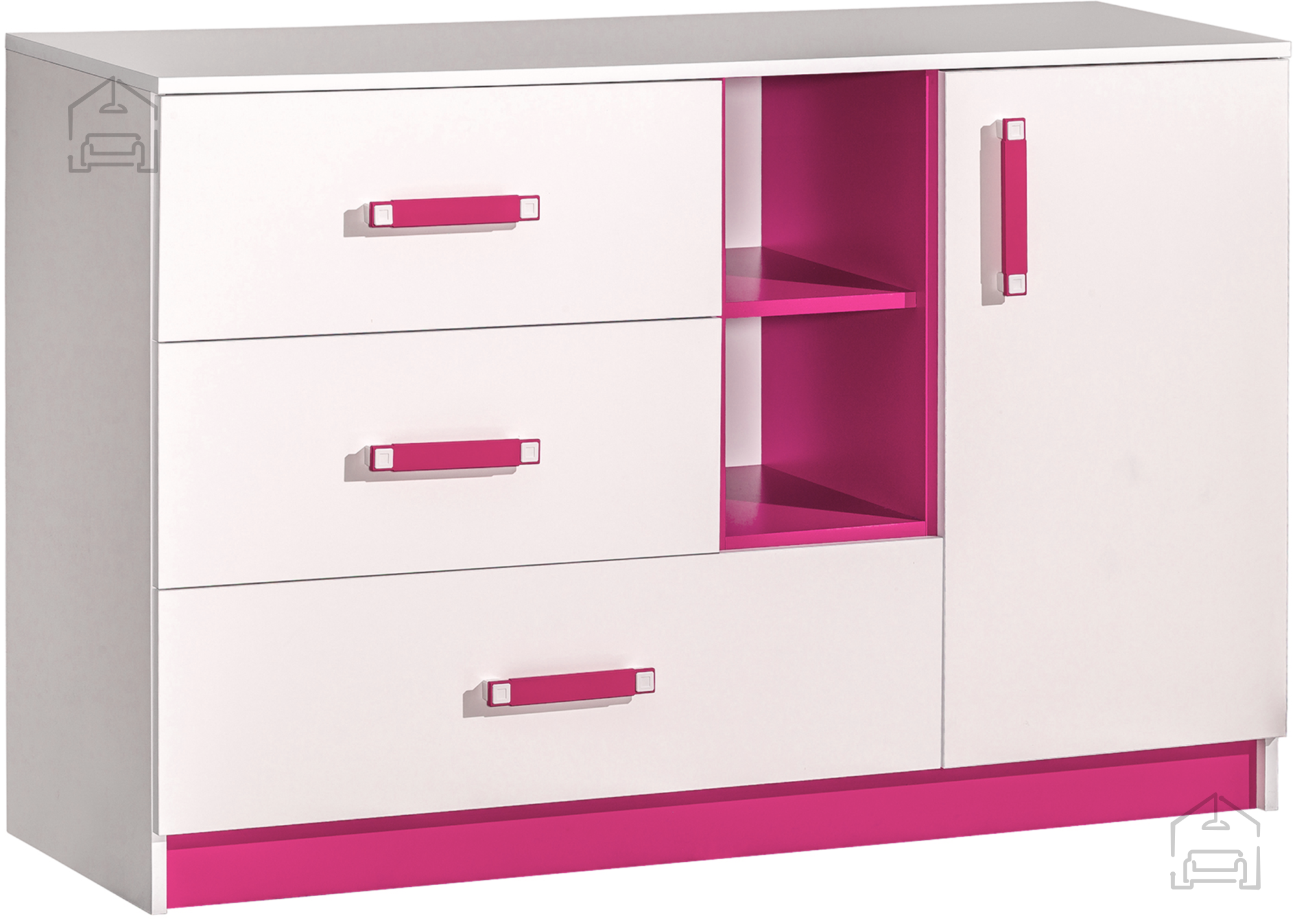 Das Zusammenspiel von Weiß und Rosa schafft einen harmonischen Kontrast, der dem Raum Helligkeit und Wärme verleiht. Weiß lässt den Raum optisch größer wirken, während die rosafarbenen Details für Sanftheit und eine persönliche Note sorgen. Die rosafarbenen Griffe aus hochwertigem Kunststoff sind ergonomisch geformt und angenehm in der Handhabung. Ihr Glanz bildet einen schönen Gegensatz zur matten Oberfläche der Kommode und sorgt so für ein ausgewogenes Zusammenspiel von Verspieltheit und Eleganz.