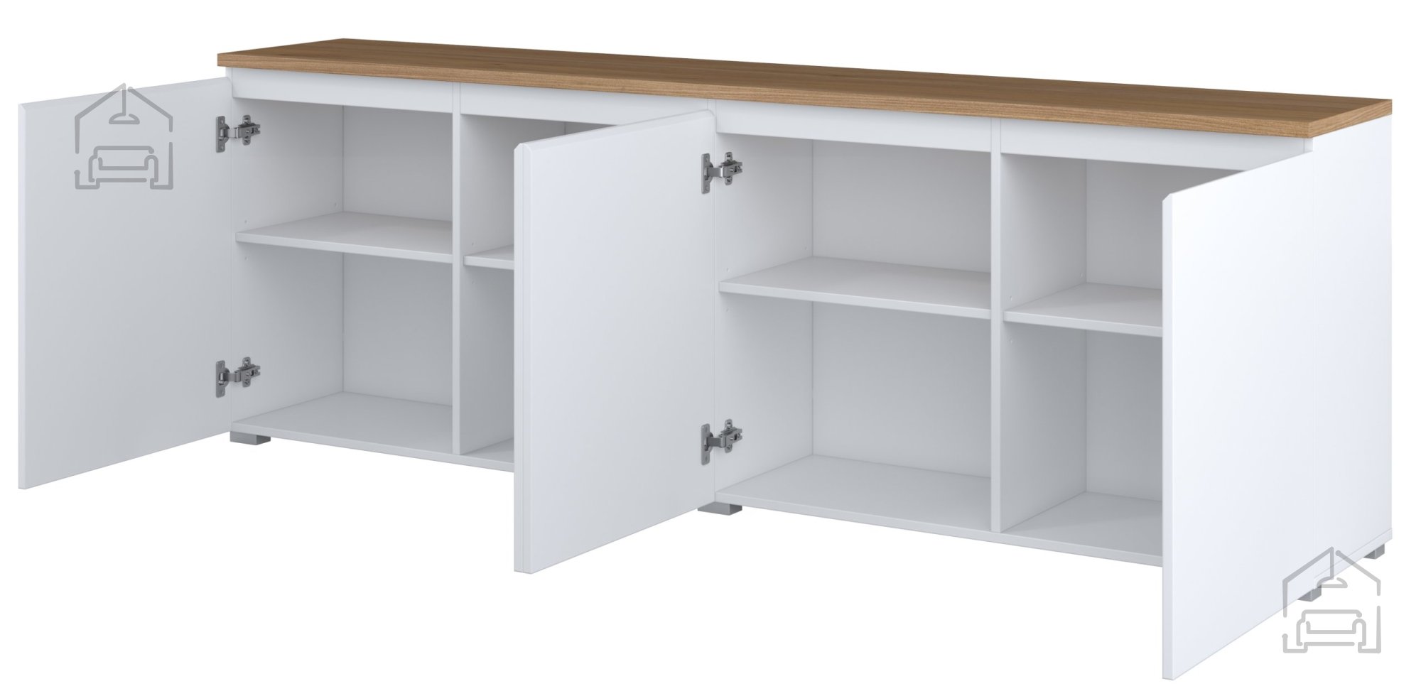 Mit ihren Maßen von 200x35x68 cm bietet die Kommode Modo 247VOJ25 großzügigen Stauraum, ohne den Raum zu überladen. Durch die vier Türen wird das Innere in mehrere Bereiche gegliedert, sodass Dokumente, Textilien, Geschirr oder andere Alltagsgegenstände gut organisiert werden können. Dank der geringen Tiefe von 35 cm ist sie eine ideale Wahl für Flure, Wohnzimmer oder Essbereiche, wo Platz optimal genutzt werden soll.