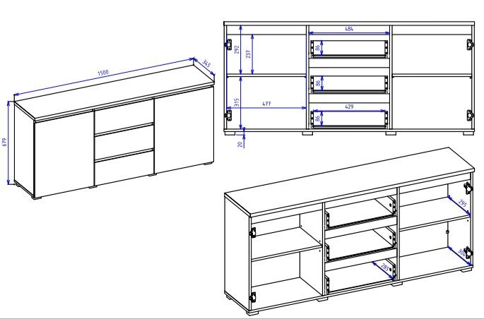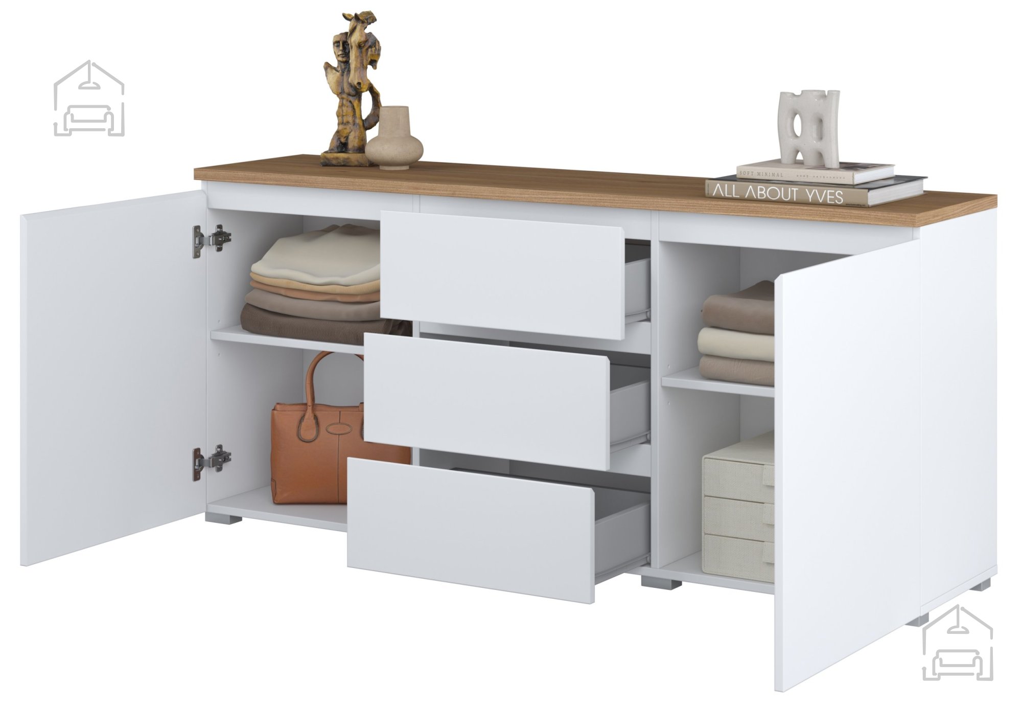Die Kommode Modo 247VOJ26 verfügt über zwei Türen und drei großzügige Schubladen, die eine übersichtliche Aufbewahrung verschiedenster Gegenstände ermöglichen. Die Schubladen eignen sich ideal für kleinere Utensilien, Dokumente oder Textilien, während die Fächer hinter den Türen Platz für größere Dinge wie Bücher, Geschirr oder Dekoartikel bieten. Durch die praktische Innenaufteilung kann die Kommode sowohl als Einzelstück im Wohnzimmer als auch als Teil einer größeren Kombination im Schlaf- oder Esszimmer eingesetzt werden.