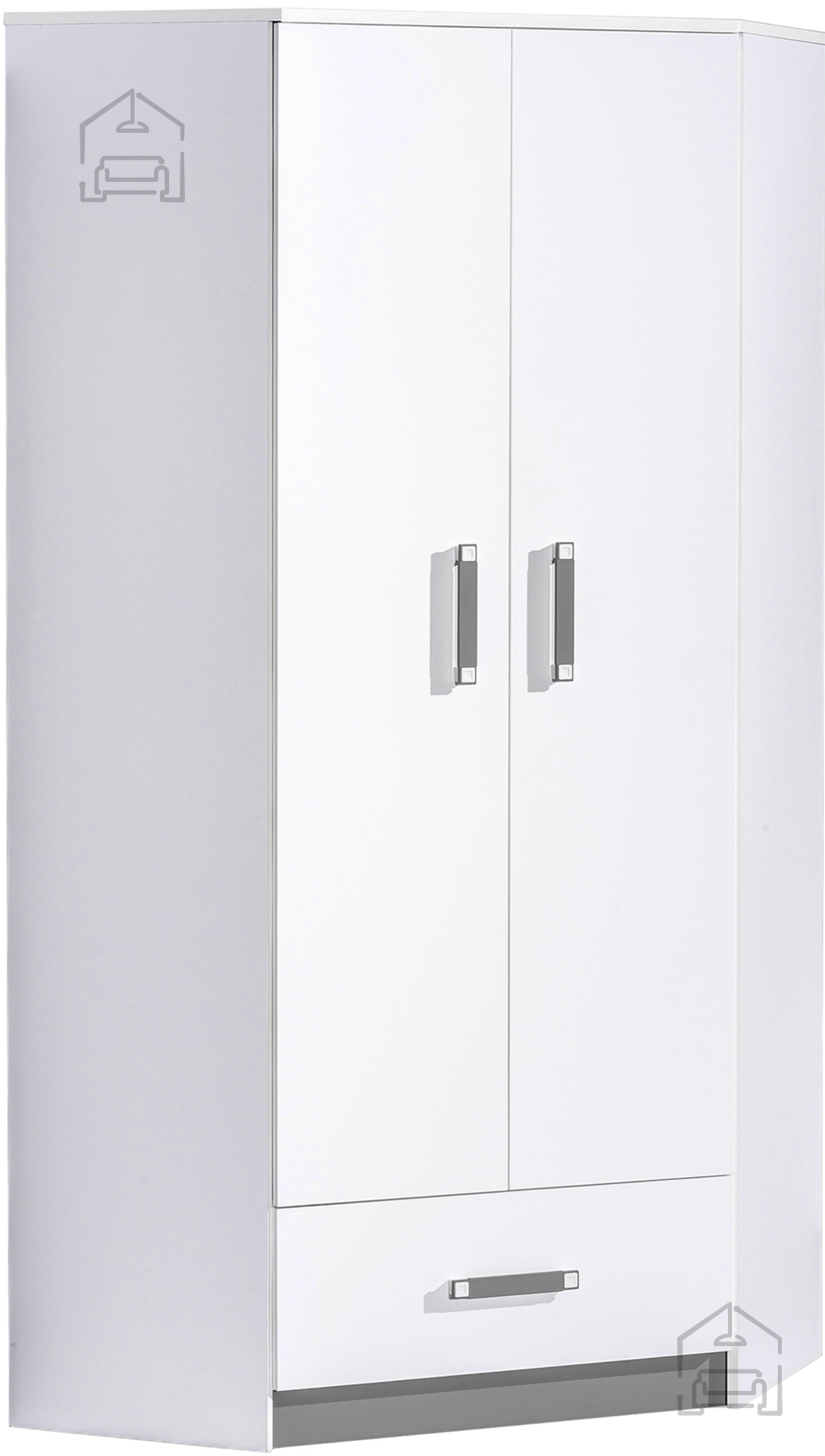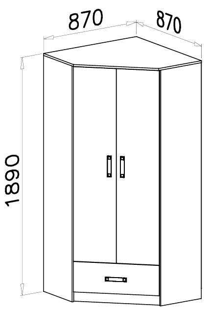 Der Schrank misst 87 × 87 × 189 cm und bietet damit ein ideales Verhältnis zwischen Stauraum und Kompaktheit. Durch die Eckkonstruktion lässt er sich wunderbar in kleinere Räume integrieren, ohne an Funktionalität zu verlieren. Mit einer Höhe von 189 cm ermöglicht er eine übersichtliche Organisation des Innenraums – die Einlegeböden und Kleiderstangen sind so angeordnet, dass alles leicht erreichbar bleibt.